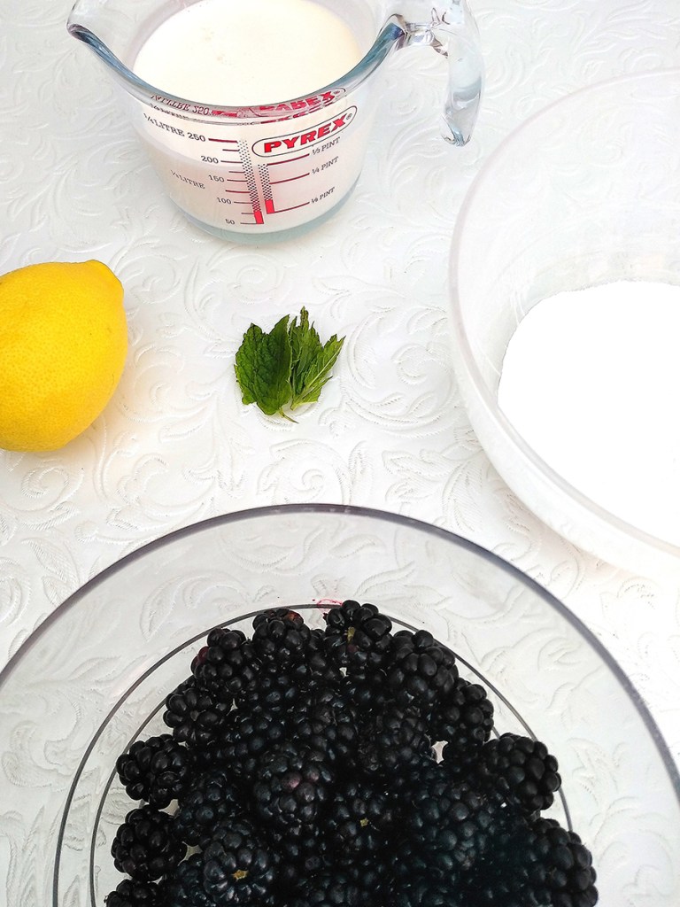 - Put the blackberries and icing sugar into a blender or food processor. Grate in the lemon zest then squeeze in the juice. Throw in the mint then whiz for a minute until you have a glossy puree. Pass the puree through a sieve into a mixing bowl to remove the seeds. Add the cream to the fruit puree and whisk until you have a thick, glossy mousse.