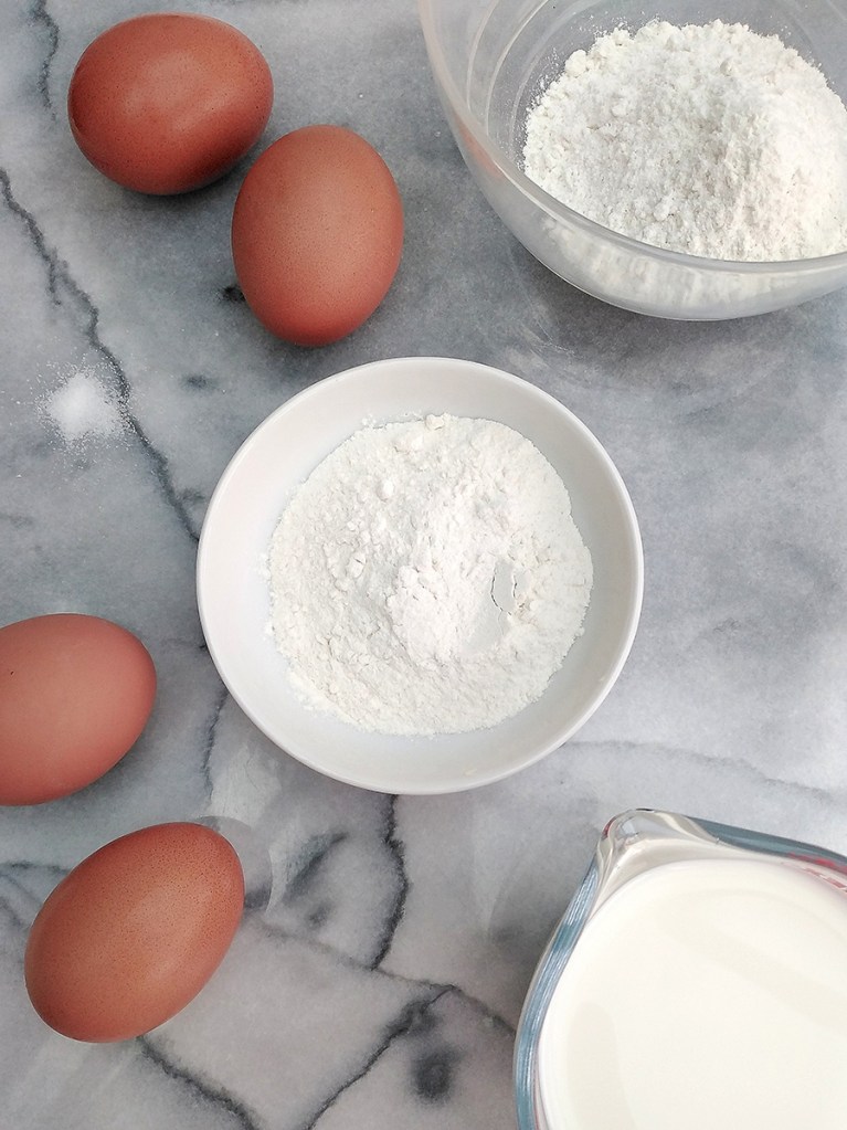 - Put all the ingredients into a large jug then use a stick blender to thoroughly whisk together into a batter. Let the batter rest for 30mins to 90mins (whatever time you have available).