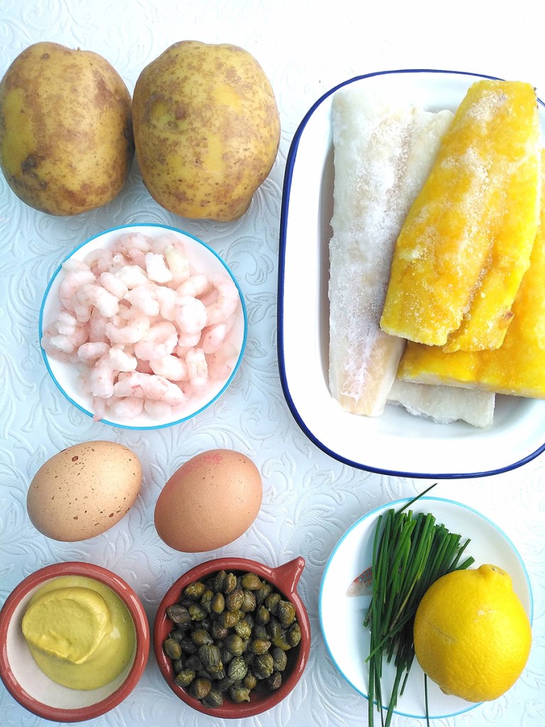 • Drain the excess liquid then put the fish into a large mixing bowl and add the defrosted and drained prawns, capers, mustard and chopped chives to the fish.