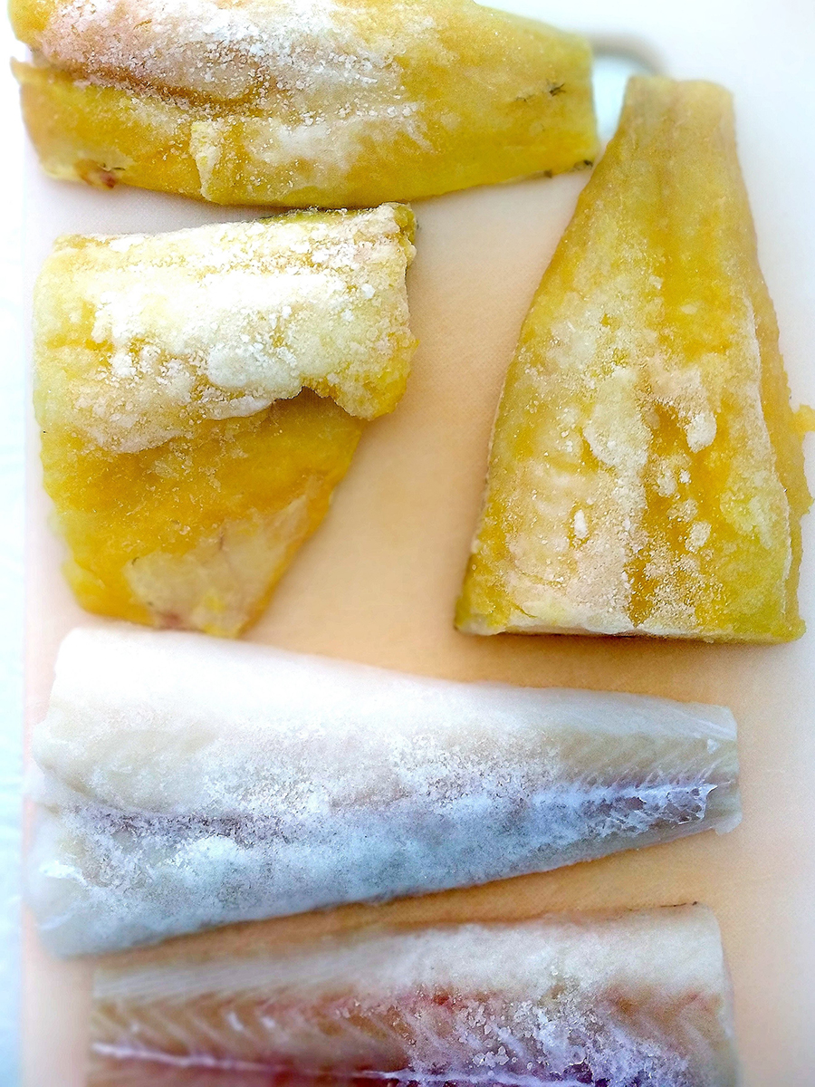 • Take the fish and prawns out of the freezer and put the prawns into a bowl of tap water to defrost.