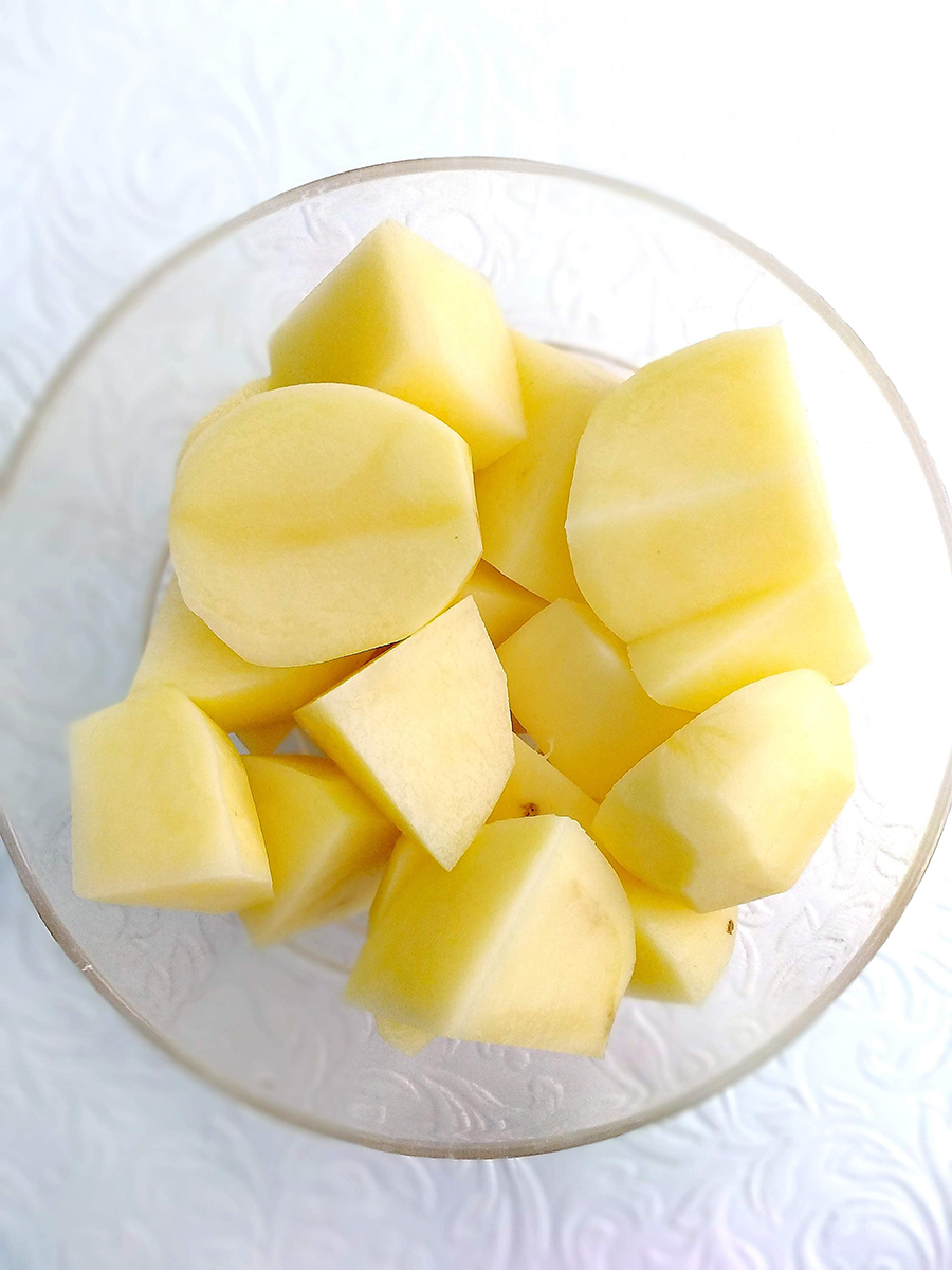 • Once dry use a fork to gently crush the potatoes (you don’t want mash, you just want to break the cubes so they can grip to the fish mixture).
