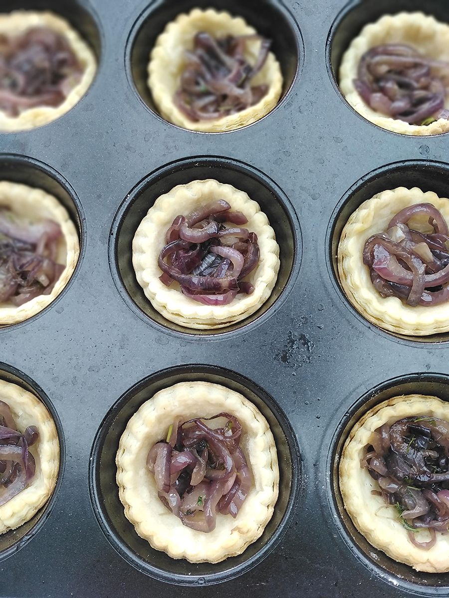 - Once the cases are out of the oven and the onion mixture has cooled slightly, divide the onion mixture between the tartlets.