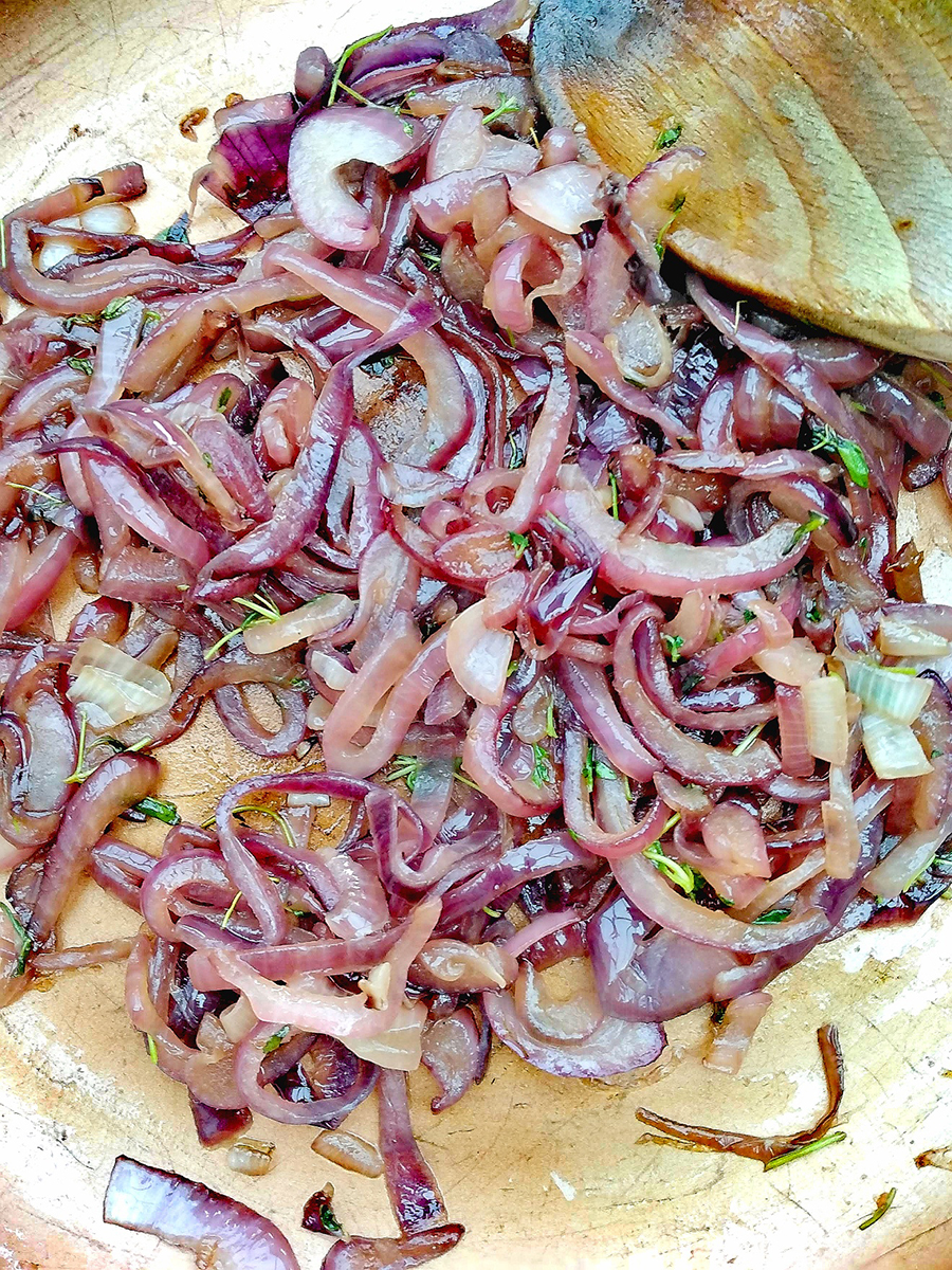 - Pop the onion slices into the frying pan and grind over some salt then keep an eye on the onions, stirring regularly making sure they soften rather than burn. Once the onions are soft and jammy turn off the heat and grind over some black pepper and sprinkle over a teaspoon of thyme.