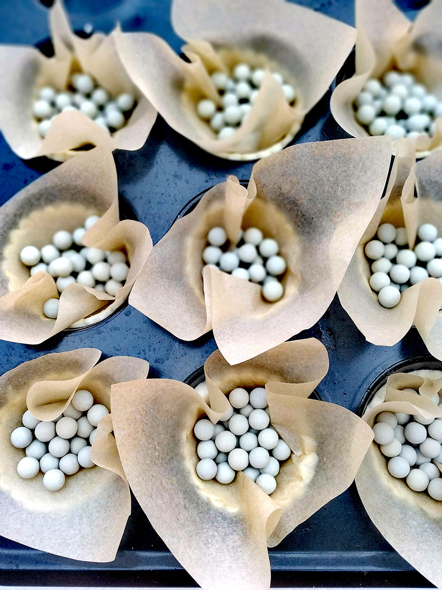 - Use a scone cutter to cut out 9-12 tartlets. Put each piece into a muffin tray hole then cover with a small piece of greaseproof paper and fill with ceramic beads or dried beans.