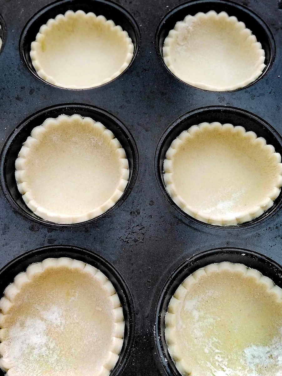- Pop the tray into the oven and bake for 15 minutes. This means you get a crispy pastry that will hold its shape. Take the blind baked shells out and turn down the oven to 195°C (175°C fan)