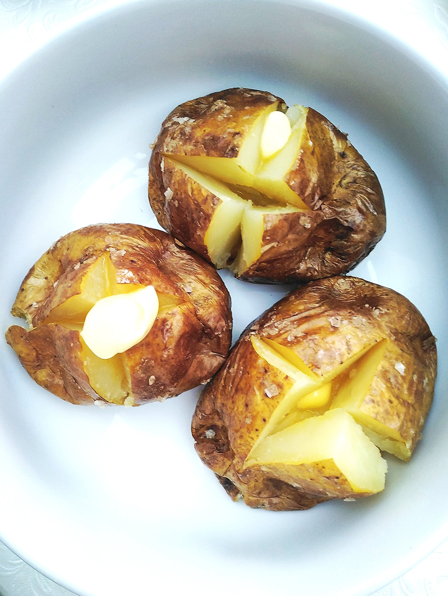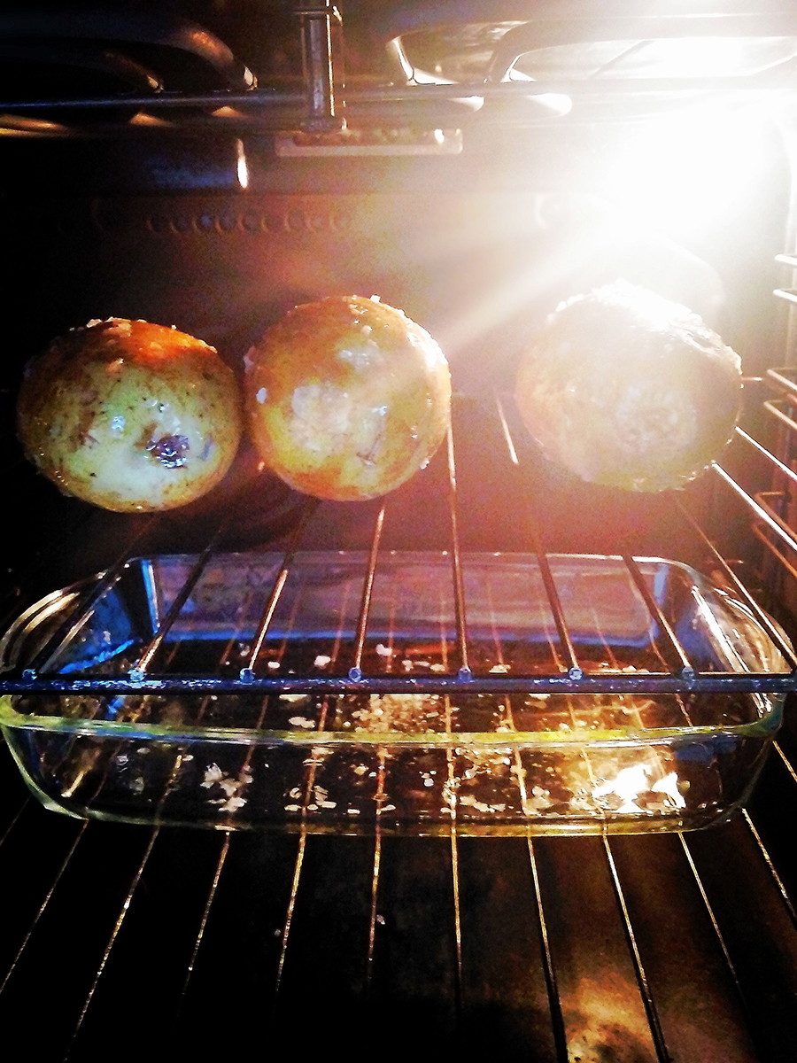 • Carefully place the potatoes straight onto the rack in the middle of the oven, slide the dish on the rack underneath and cook for 70 minutes. Once the potatoes are cooked you should be able to slide a knife in easily. Cut a cross into the top of the potatoes and squeeze to expose the centre then add a knob of butter.