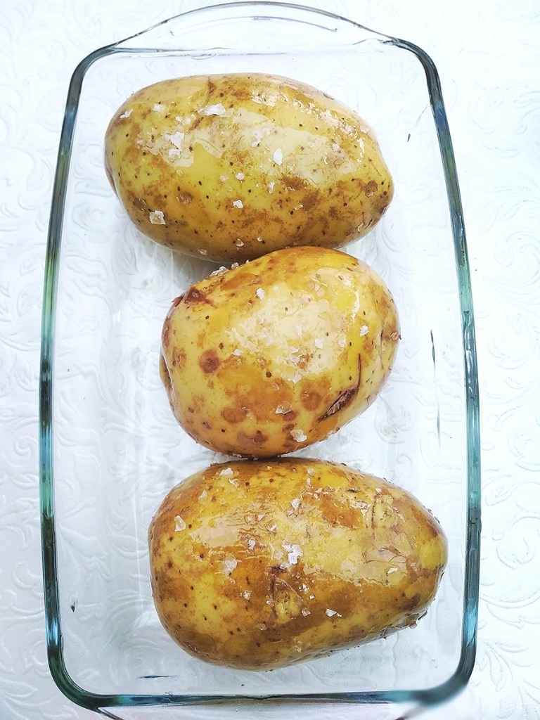 • Pre-heat the oven to 200°c (180°c Fan) and place a rack in the centre of the oven. Wash the potatoes then dry thoroughly with a tea towel. Prick the potatoes all over with a small knife then put them in an ovenproof bowl and drizzle over 1 tbsp of olive oil. Rub the oil all over the spuds with your hands then sprinkle over the salt.