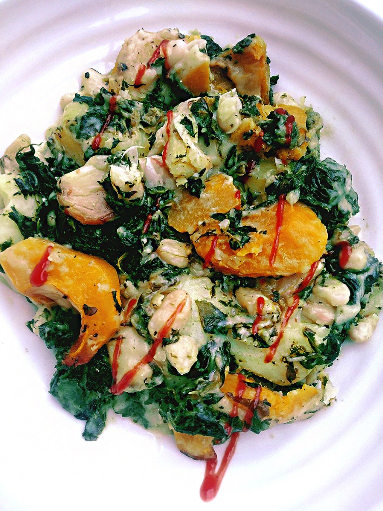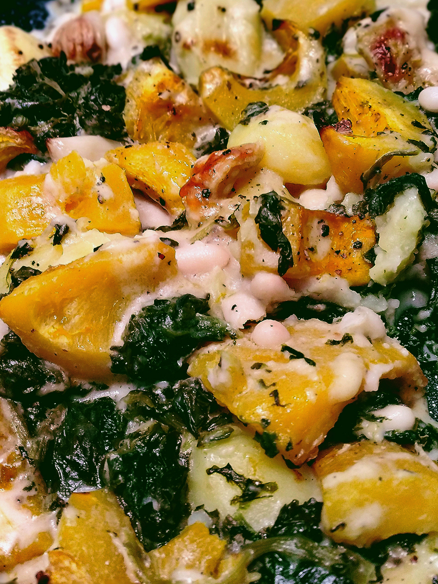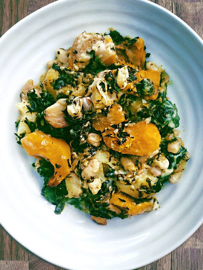 I can’t resist buying squashes when they start to flood the markets. I love the texture and sweetness of these knobbly, multi-coloured veggies. When experimenting with a couple of squashes one day I coupled them with some frozen spinach and made this spoon-lickingly good dish. If you’ve been unsure about trying squash because the skin looks like a challenge I have a trick that makes it super easy to remove. I love food that does you good but feels like comfort food and this is one such dish. Cheesy Squash, Spinach and Garlic Bake makes a great side dish for a big Sunday lunch but it’s delicious by itself.