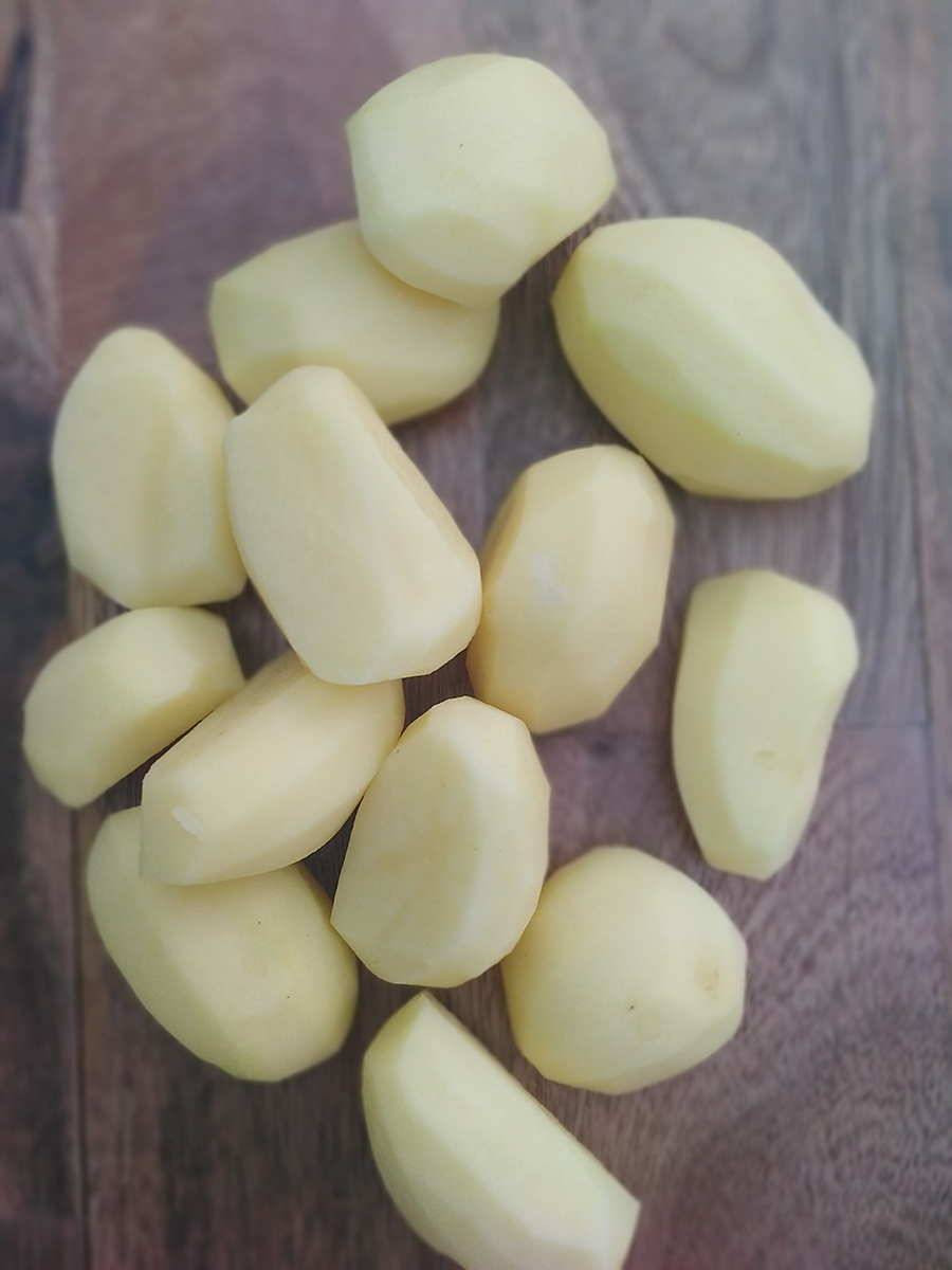 - Pop the tray into the pre-heated over for 20 minutes. Peel the potatoes then place in cold, salted water and bring to the boil. Once the water is boiling cook them for 5 minutes then drain.