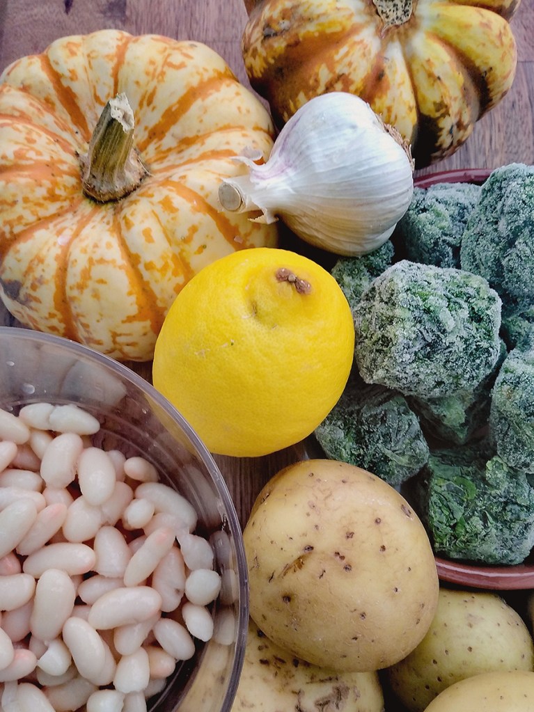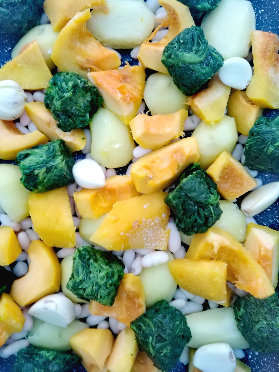 - Squash the head of garlic and remove each clove from the skins. Evenly arrange the potatoes, cannellini beans, squash, frozen spinach blocks and garlic cloves in a large baking tray. Squeeze over the juice of half a lemon and generously grind over salt.