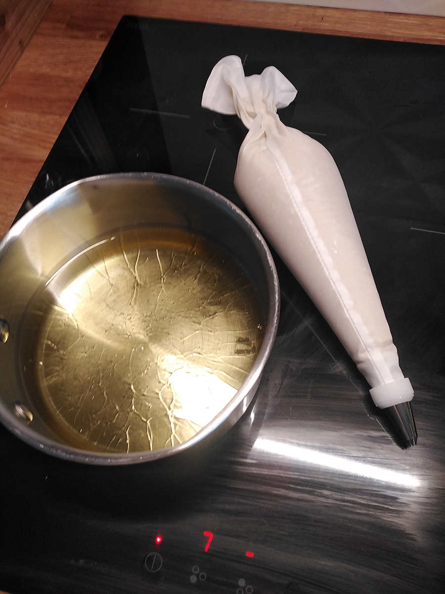 - Put your oven on to a low temperature (50-100°C). Put 500ml of veg oil into a clean milk pan or small, deep-sided skillet and turn the heat up to medium high to high. The key to getting an even colour on your churros is to get the heat just right so that the dough doesn’t burn. I start with a high heat, drop a bit of dough in, see if it browns too quickly or not then adjust the heat accordingly.