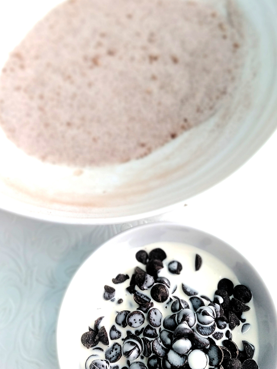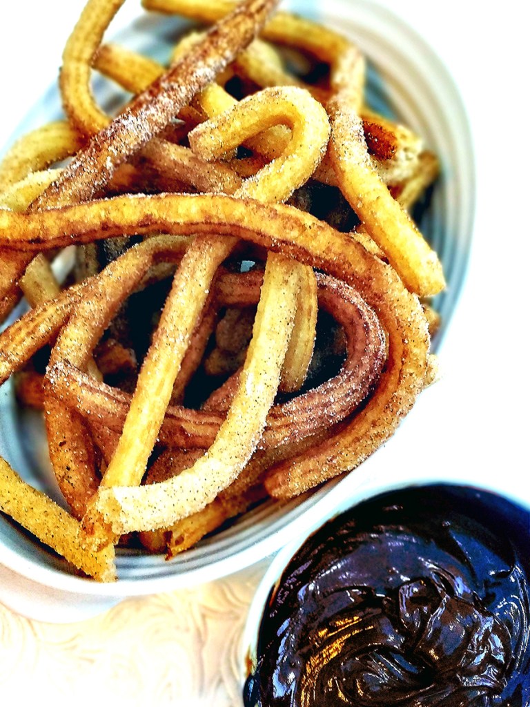 - Once all the batter has been fried you can prepare the sugar coating and dip. Pour the 60g of sugar and cinnamon into a wide bowl and whisk to mix. Put the chocolate chips and cream into a microwave safe bowl then melt in the microwave on a low heat until you can stir the chocolate and cream into a sauce. Take the warm churros and toss small batches in the sugar until all the churros are coated and serve with the warm, dark chocolate sauce.