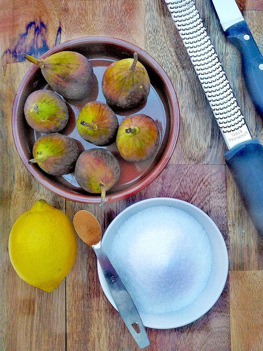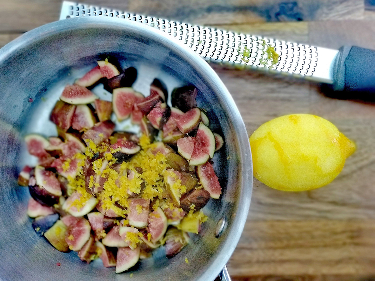 - Remove the stalks from the figs then cut the flesh into small cubes. Put the fruit into a small pan. Grate the zest of the lemon into the pan using a fine grater (microplane) then squeeze in the juice (make sure you don’t get any pips in the pan).