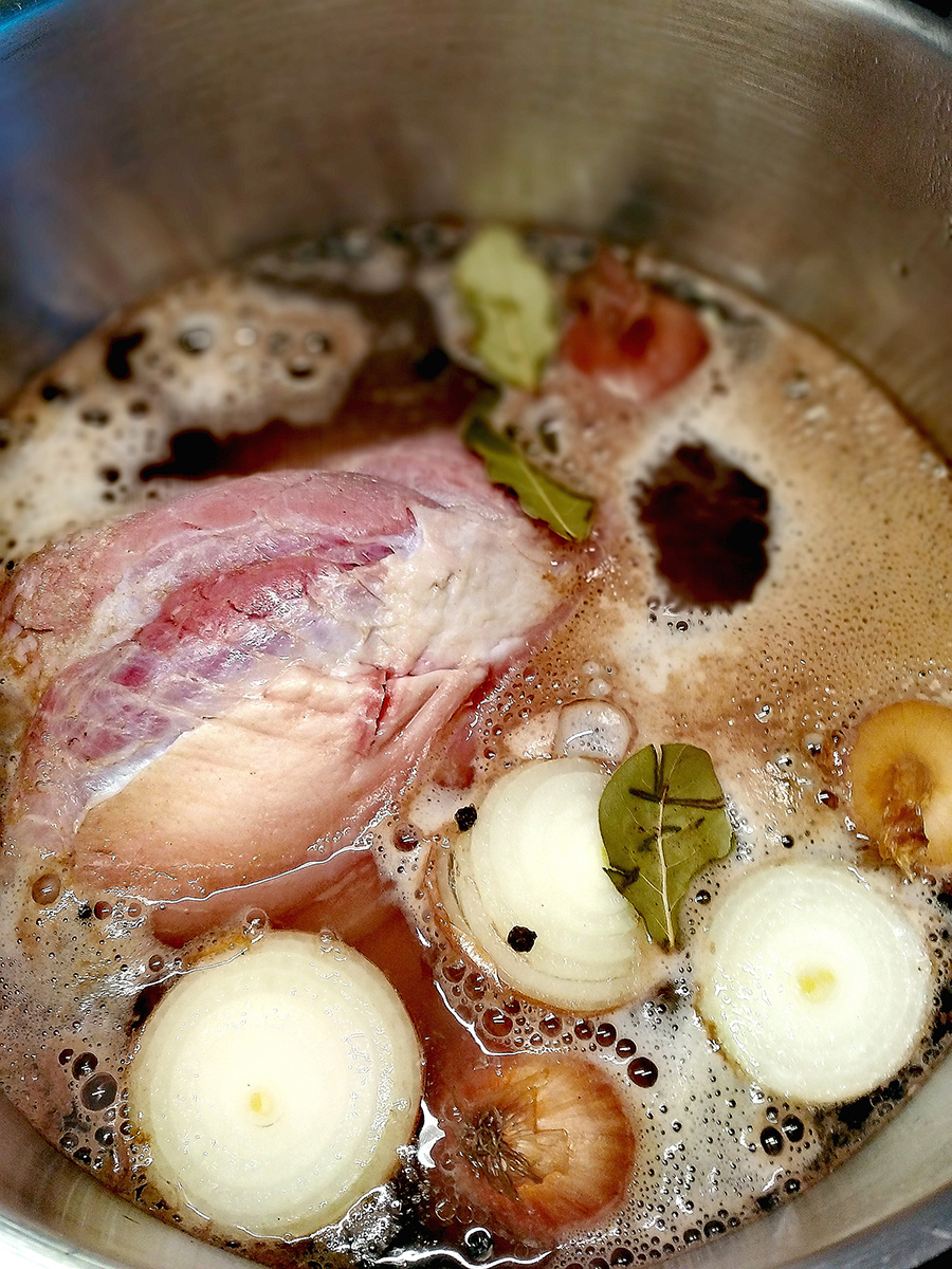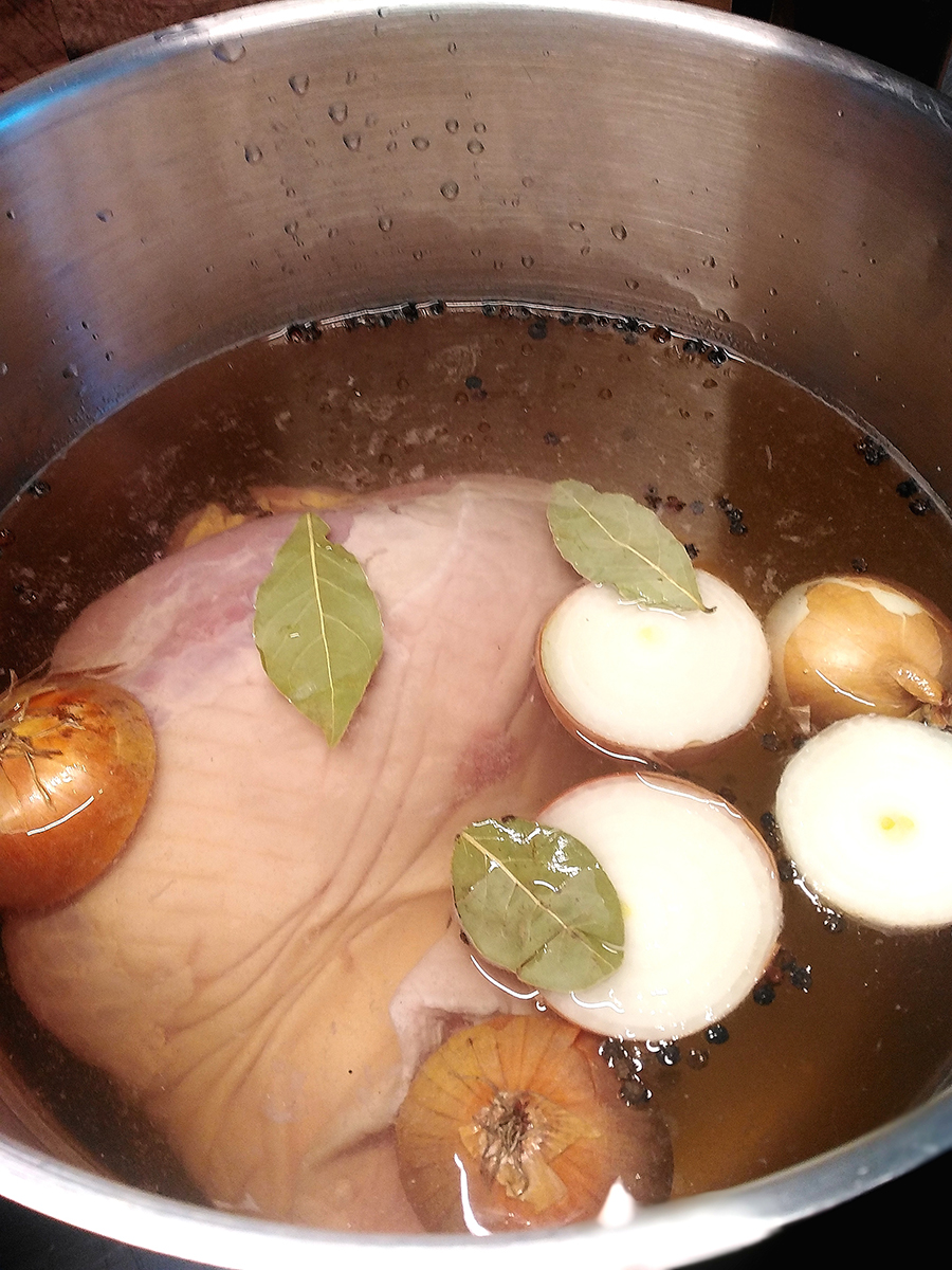 - Place the gammon joint skin side down in a large stock pot (you need to be able to completely cover the meat in liquid). Pour over the cider then top up with water until the meat is covered (probably another 3-4 litres). Cut the onions in half then add to the pot along with the bay leaves and peppercorns.