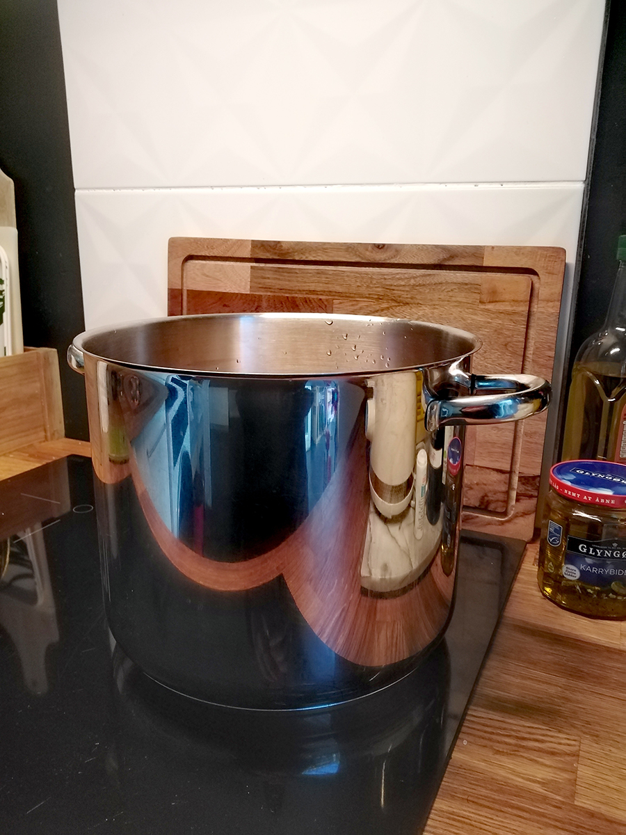 - Pre-heat the oven to 230°c (210°c Fan). Place a rack in the middle of the oven (you want the top of the meat to be about 10 cm from the top of the oven when it’s in the roasting tin. Remove the boiled meat from the pan (don’t throw the liquor away just yet) and place on a foil lined roasting dish.