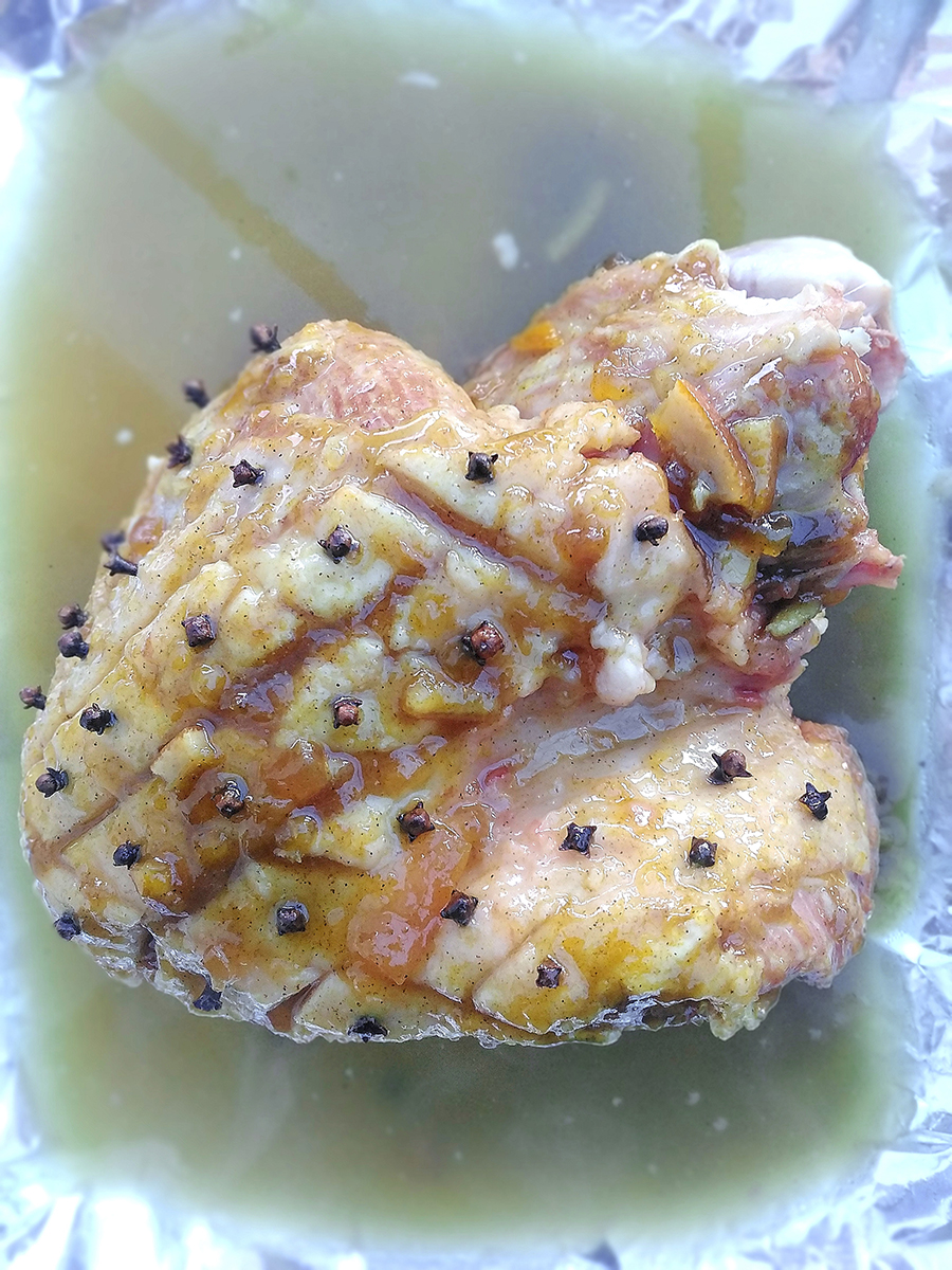 - Pour 400ml of the poaching liquor into the bottom of the roasting dish then pour the glaze over the fat. Spoon the glaze and liquor mixture over the sides of the meat. Place a clove in each diamond, this is partly for flavour, partly for decoration and partly for tradition, then put the meat into the scorchingly hot oven for 15 minutes.