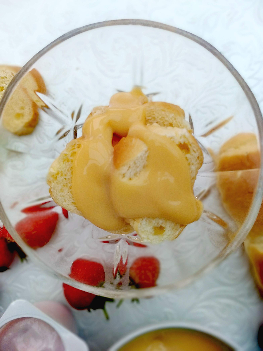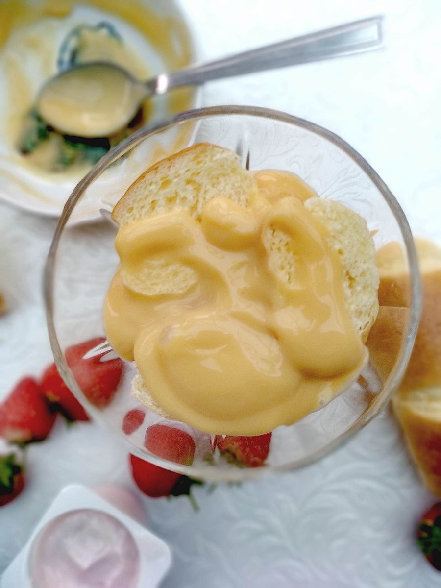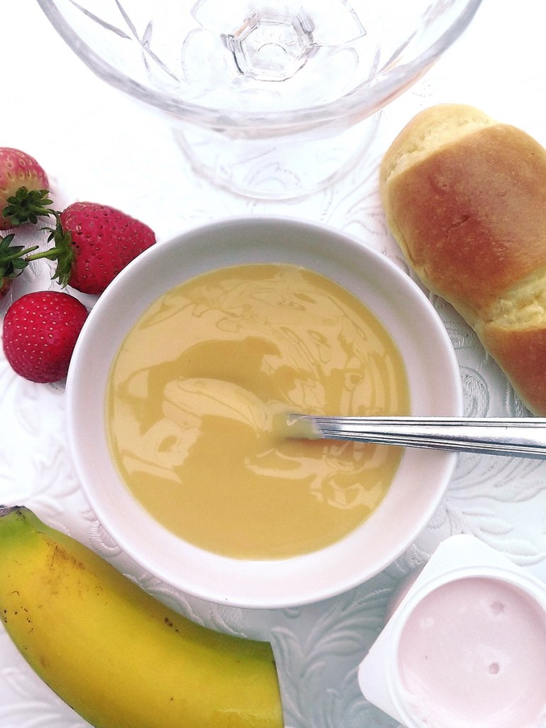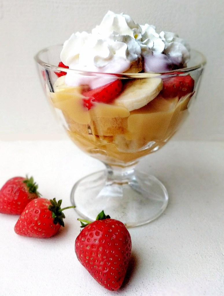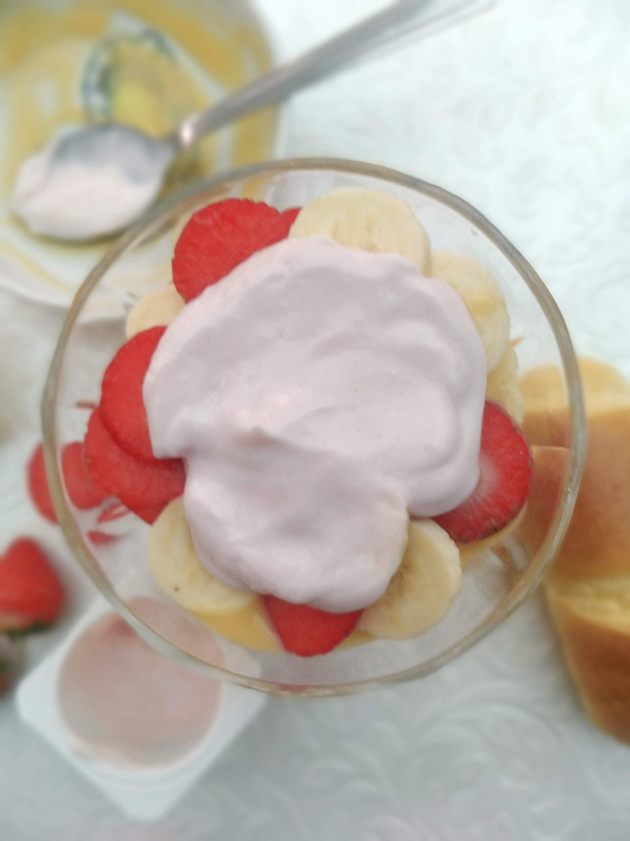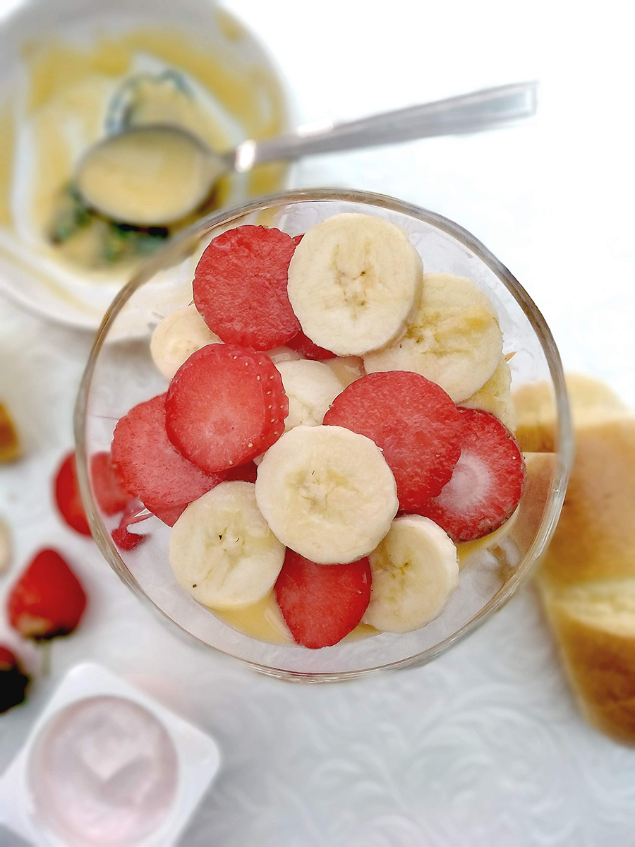 - Slice the brioche into rounds. Add a tablespoon of custard to the bottom of the glass then layer with brioche and repeat with another spoonful of custard, layer of bread and one last spoonful of custard. Slice the banana and strawberries and add a layer of fruit on top of the custard. Add half a pot of fromage frais and spread over the fruit.