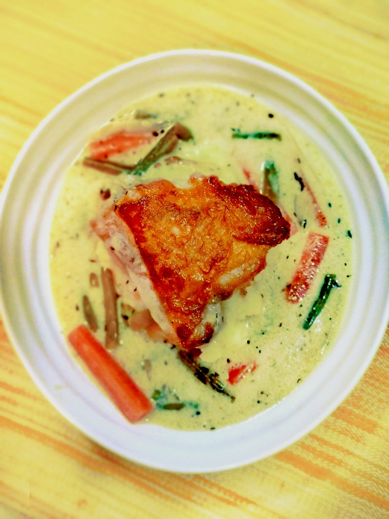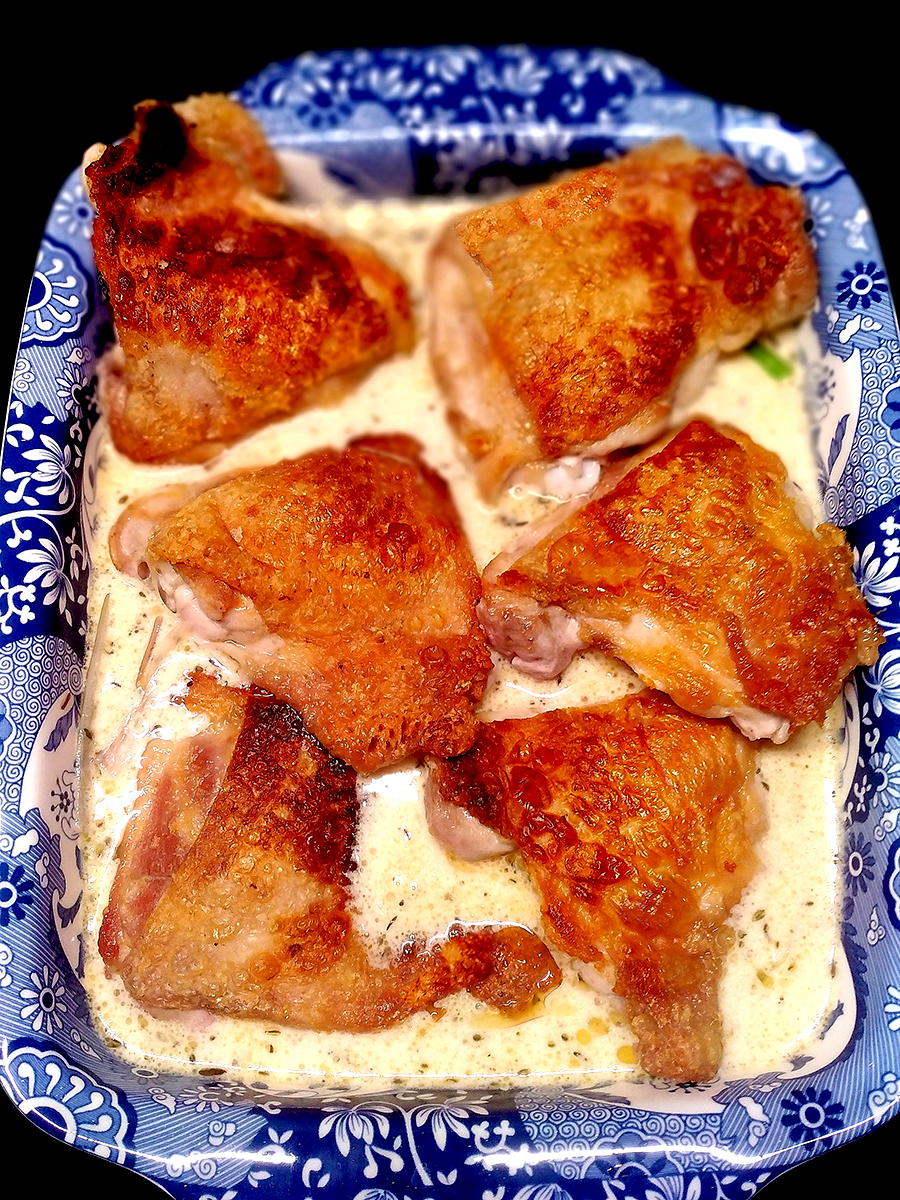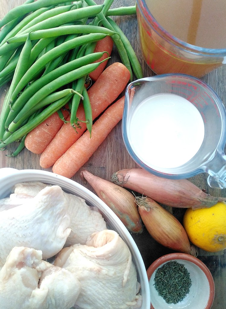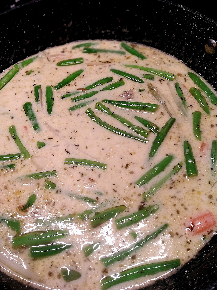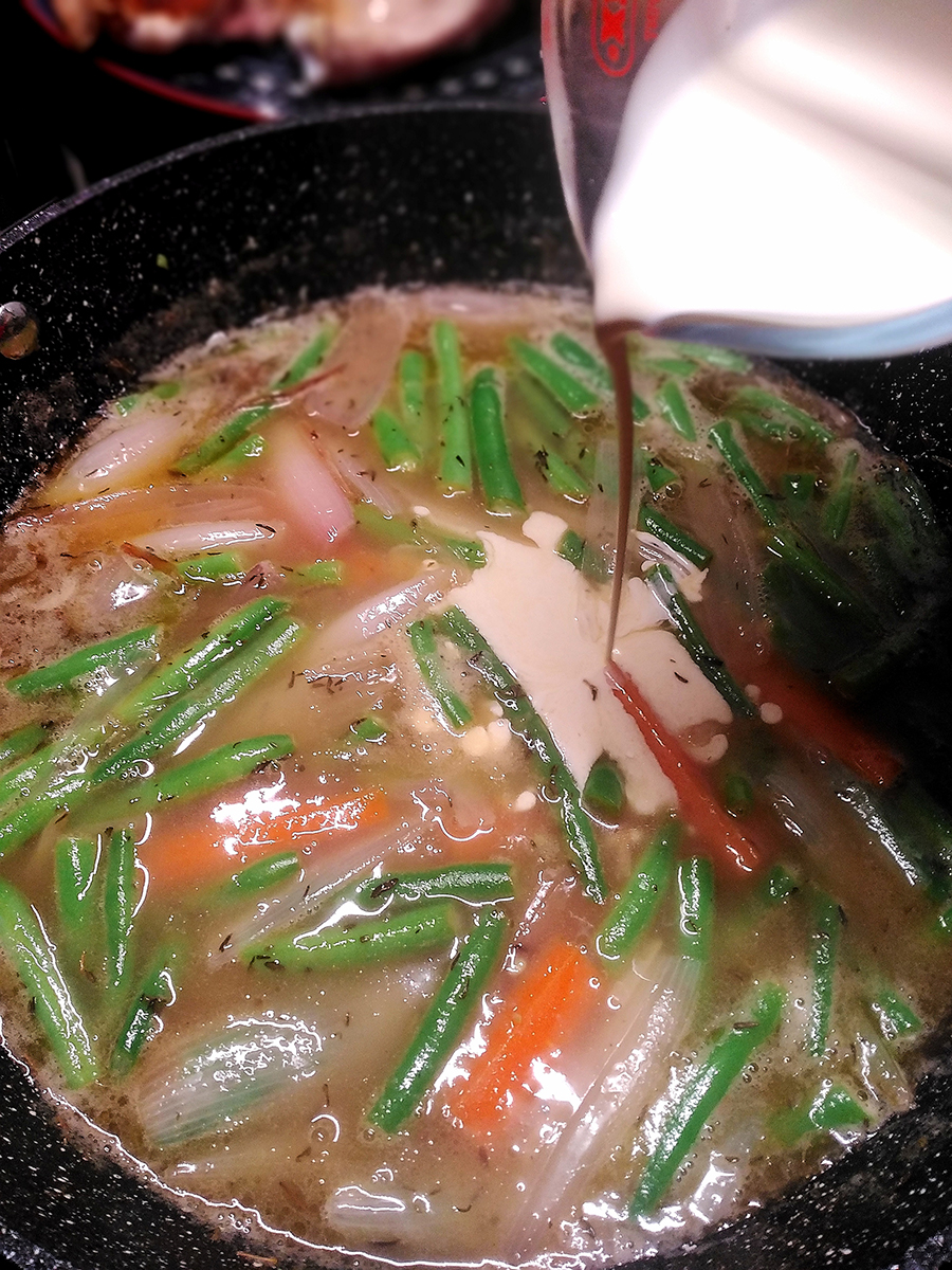 - Turn the heat off under the pan and add the thyme and trimmed green beans. Slowly pour in the cream and stir to combine then place the chicken on top of the sauce so that the skin is exposed and bake in the oven for 25 minutes. (If you want to pour the sauce into a casserole dish before adding the chicken and baking you can.)