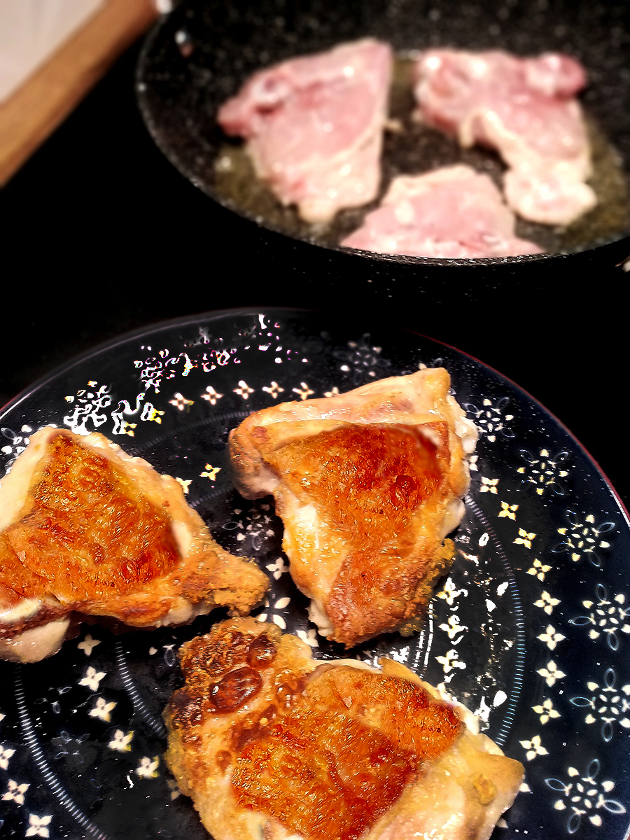 - Pre-heat the oven to 195° (175° fan). Put the olive oil in a large oven-proof skillet on a medium high heat. Dry the skin of the chicken with kitchen roll then sprinkle with salt. Place the chicken in the pan, skin side down. Do this in batches so that the pan isn’t overcrowded. If there’s too much chicken in the pan it won’t crisp up. Once the skin is crispy (about 4-6 minutes in the pan) place the chicken, flesh side down, on a plate.