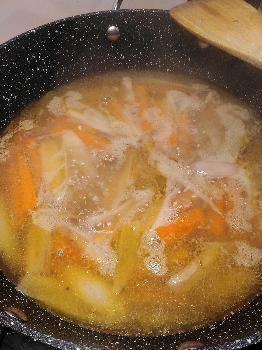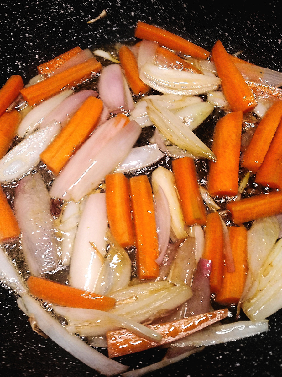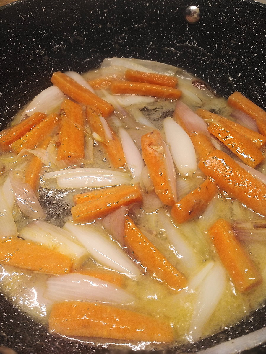 - Peel the shallots and clean the carrots. Cut the shallots lengthways in half and chop the carrots into batons. Add the shallots and carrots to the pan (turn the heat down on the pan slightly, you don’t want the shallots to burn). Sprinkle over the cornflour and stir until it has been absorbed by the fat. Gradually add the stock while stirring then squeeze in the juice of half a lemon. Bring to the boil for two minutes.
