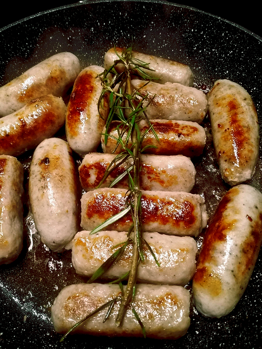 - Add a little vegetable oil to a large skillet and place on a medium high heat and once the pan is hot add the sausages and rosemary then brown on one side for 3 minutes then turn and brown for another 2 minutes.