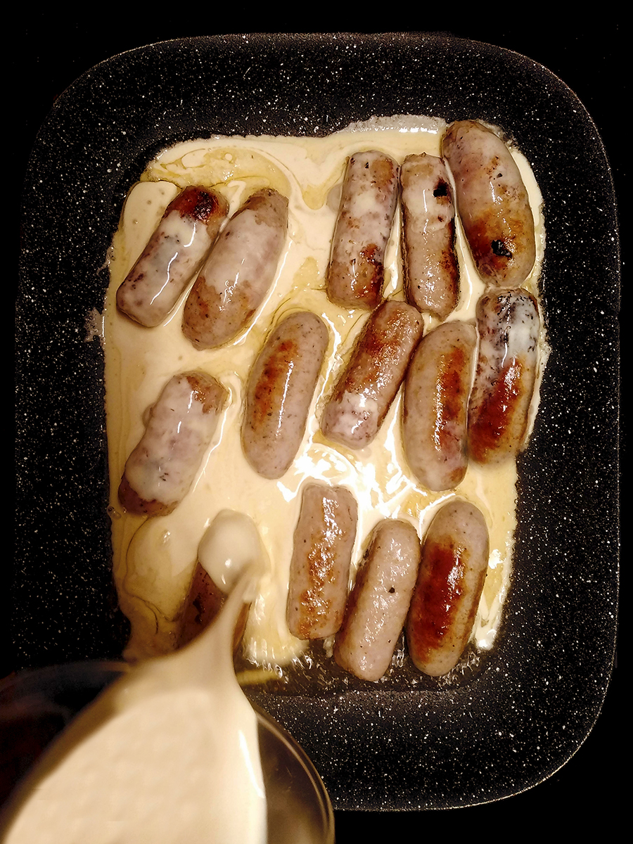 - Carefully take the piping hot tin out of the oven and use tongs to move the sausages from the skillet into the pan then pour over the batter and pop back into the oven for 20 minutes. Leave the rosemary in the skillet.
