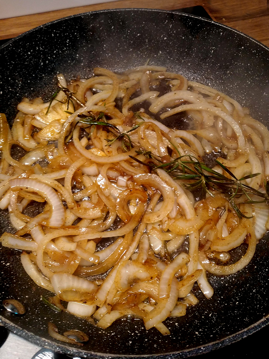 - Whilst the toad is cooking, peel and slice the onion then add to the skillet you cooked the sausages in with the butter then grind over with salt. Cook on a medium high heat until the onions are soft (about 10 minutes) stirring regularly. Add the balsamic and stir to pick up the flavours left in the pan.