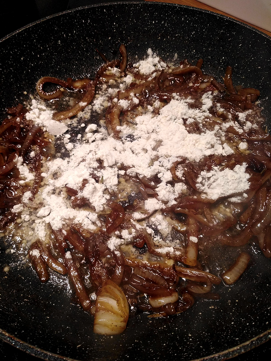 - Sprinkle over the flour and crumble over the stock cube and stir then add the water and stir to combine. Lower the heat and simmer until the toad is ready then pour liberally.