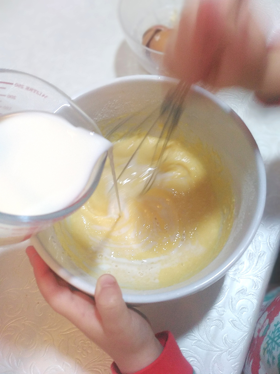 - Pre-heat the oven to 220° (200° Fan) with a shelf on the lower middle shelf. Put both flours and the salt into a mixing bowl then crack in the eggs and whisk together. Gradually add the milk and whisk until smooth (this is one of Henry’s favourite jobs).