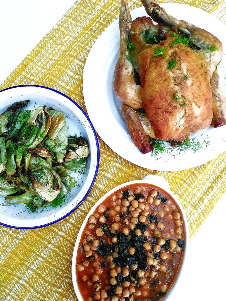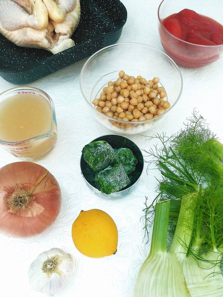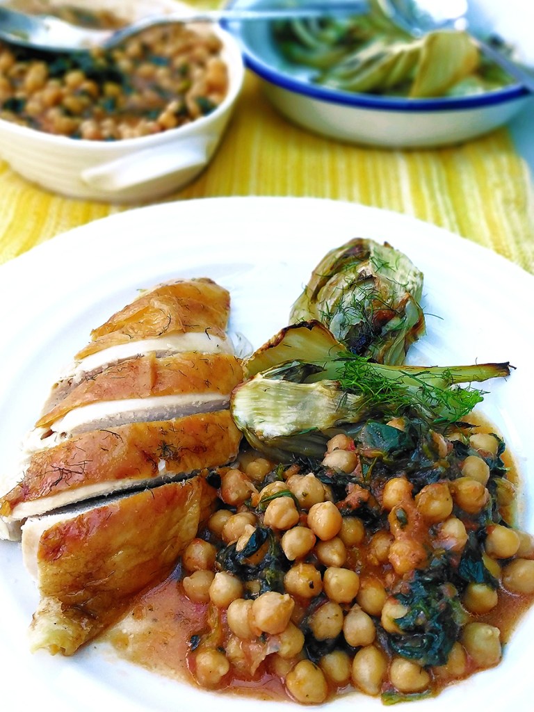 - Put the drained chickpeas in a large skillet then pour over the tomato sauce. Add the frozen spinach to the sauce and cook until the spinach leaves have separated and cooked. Squeeze over half a lemon and taste to adjust for seasoning with salt or pepper. Take the fennel out of the oven and squeeze over half a lemon then sprinkle over some chopped fennel fronds. Carve the chicken and serve with the chickpeas and fennel.