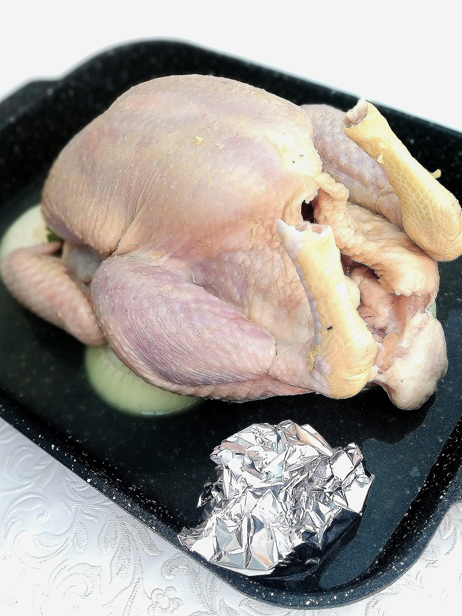 - Drizzle a tsp of olive oil over the chicken and grind over with salt then rub evenly all over the chicken. Peel the onion and slice into 4 equal discs. Put the discs in the centre of the roasting tray and place the herbs on top. Place the chicken on top of the onion and herbs so that all the herbs are hidden under the meat so that they don’t burn.