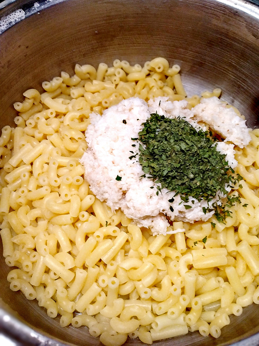 - Drain the cooked pasta and return to the saucepan then add the drained crab, parsley and the lemon juice. Grind over black pepper then stir to combine. Gradually stir in the cheese sauce then tip into a baking dish.
