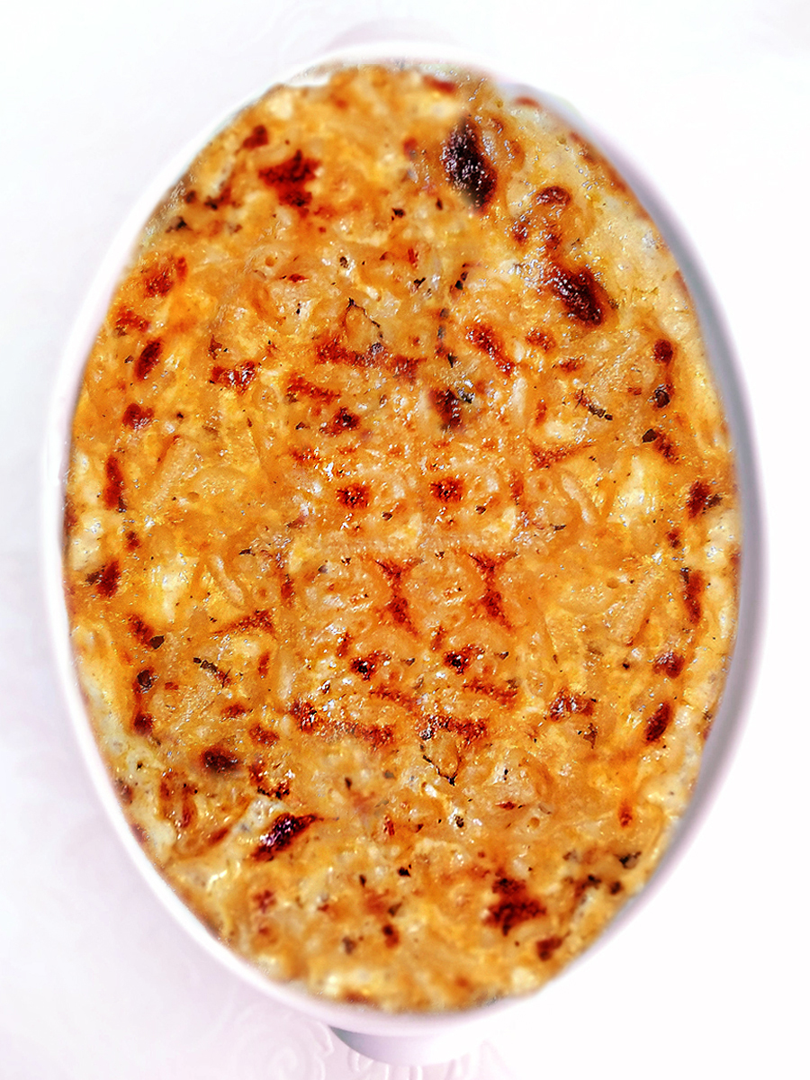 - Put the dish under a medium high grill for 15 minutes (I set my grill to 180°) until the top is golden. Serve with salad or as a side for grilled meats, surf and turf style.