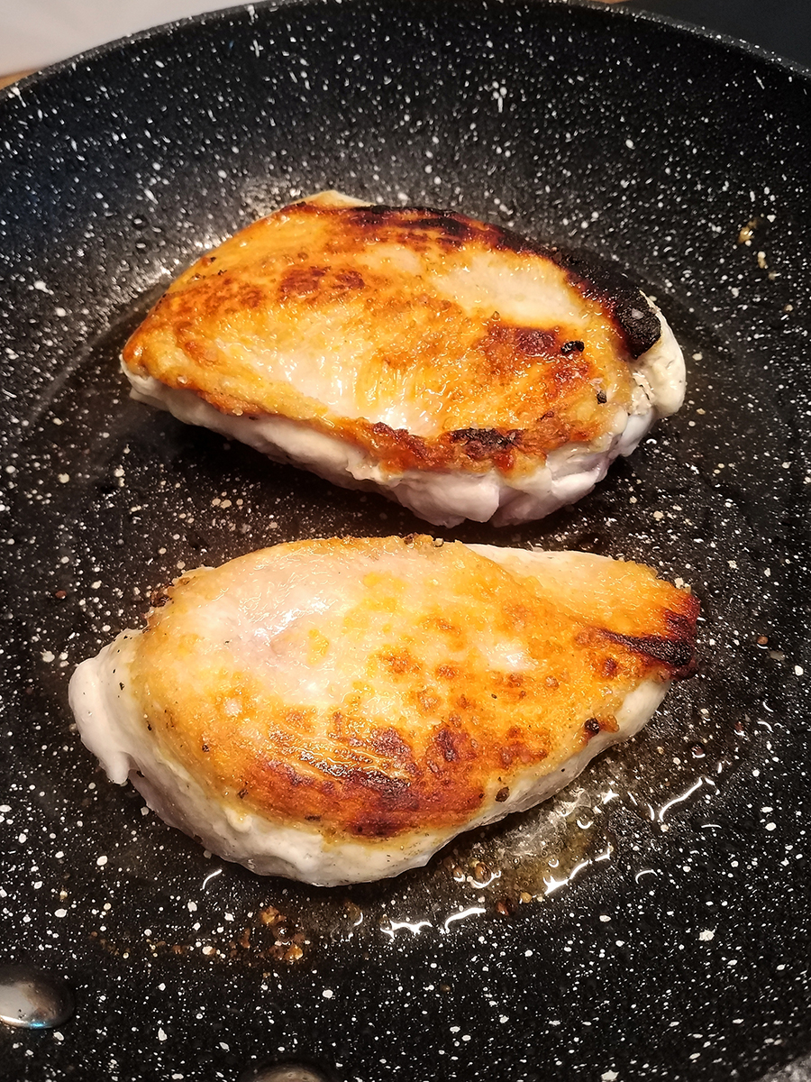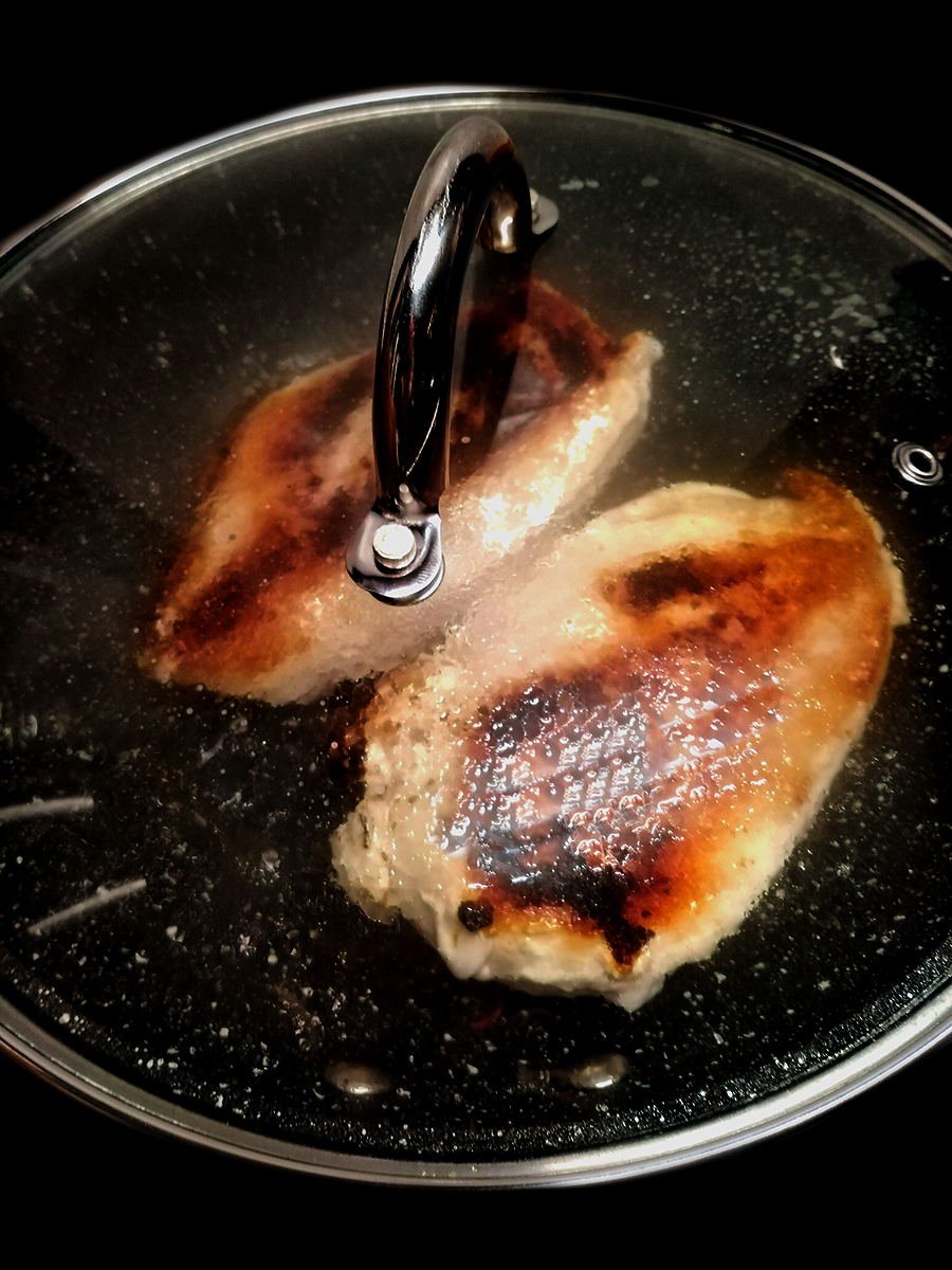 • Do not move the chicken for 4 minutes then turn the chicken breasts over, put the lid on and turn the heat way down to very low and set a timer for 20 minutes. You get beautiful pan juices that can be added to gravy, sauces or dressings. This is the only way I cook whole chicken breasts because they come out flavourful and juicy every time.