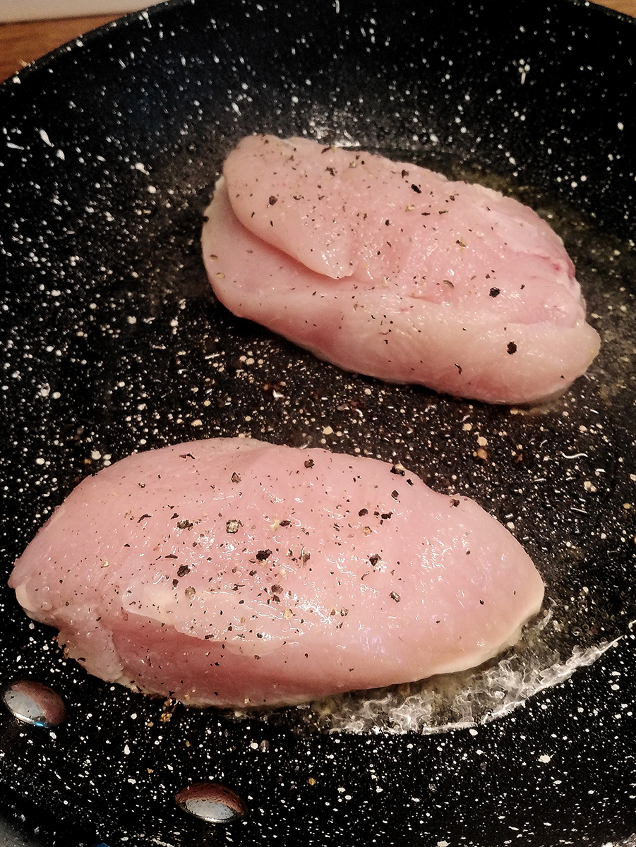• Get a small frying pan that has a lid then add the vegetable oil and heat to a high heat (I use my third highest setting). Sprinkle the chicken breasts with salt on both sides then, once the pan is hot, place the chicken in breast side down in the pan.
