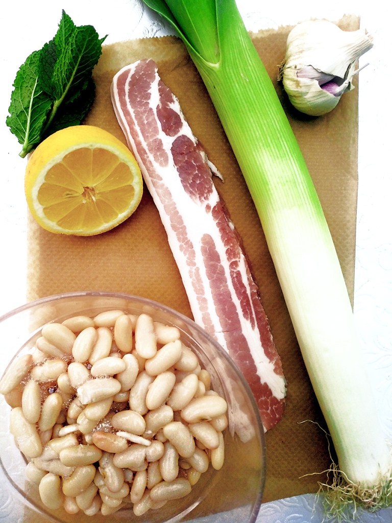 - Peel and roughly chop the garlic. Remove the lid, add the garlic and cook for 1 minute then add the drained cannellini beans and grind over with salt. Add the bacon back to the pan and cook for 2 minutes then turn off the heat. Roll the mint leaves into a cigar shape then finely cut. Squeeze the lemon juice of half a lemon (approx. 2 tbsp), sprinkle over the mint, stir and serve.