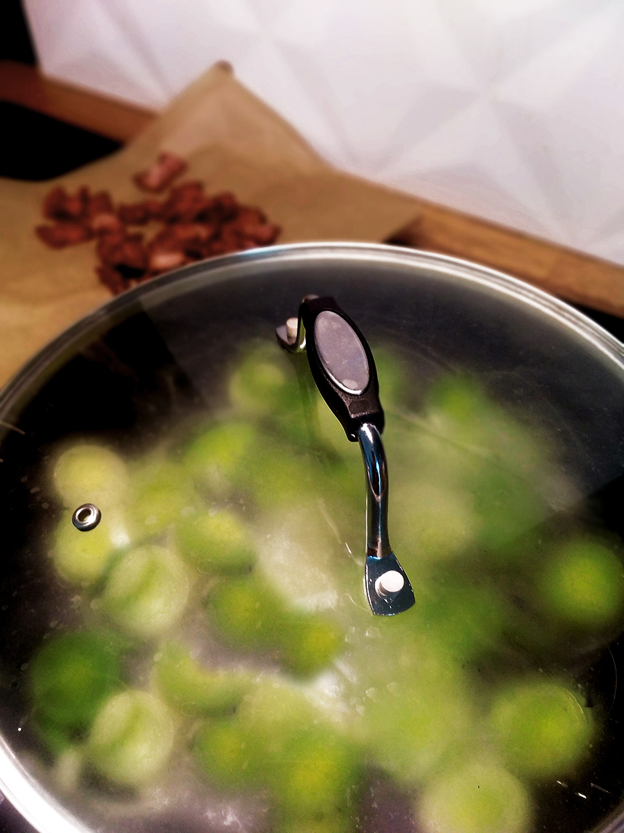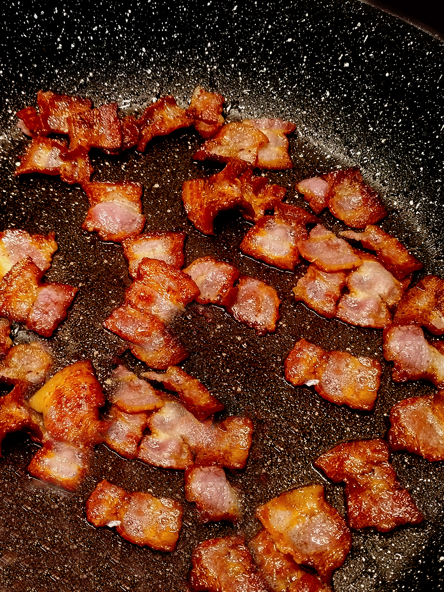 - Cut the bacon into squares (you don’t want them too small). Put 1 tbsp of olive oil in a large skillet or frying pan and cook on a medium high heat until crispy then remove the bacon from the pan to drain on some kitchen roll. Tip any excess oil from the pan but don’t wipe it (you want the bacony flavour). Turn the heat to medium and add 2 tbsp of olive oil.