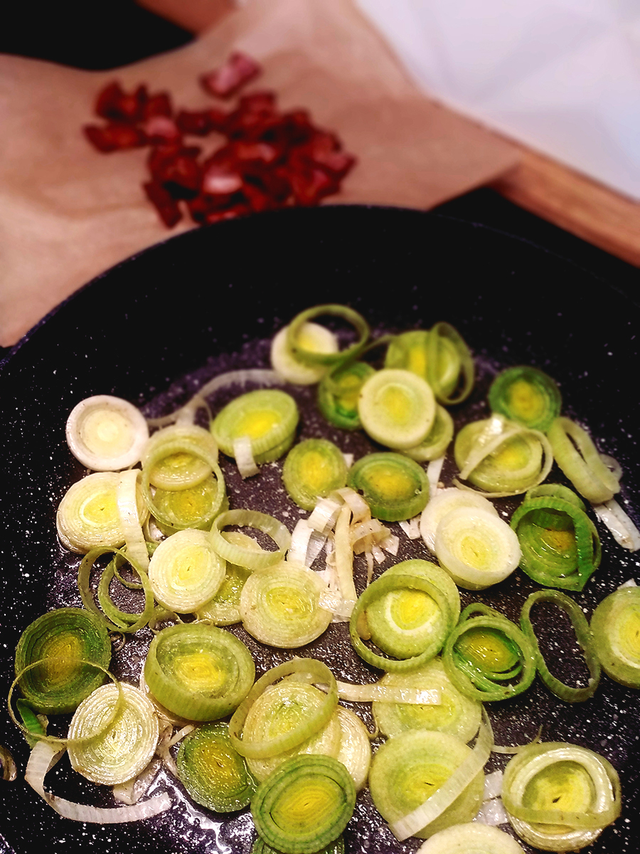 - Discard the woody top and root bottom of the leek then cut into 1cm wide rounds (make sure it’s clean of any grit). Put the leeks into the pan, grind over with salt then put a lid on and cook for 2 minutes. This will steam and colour the leeks.