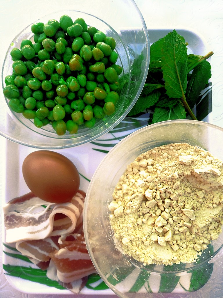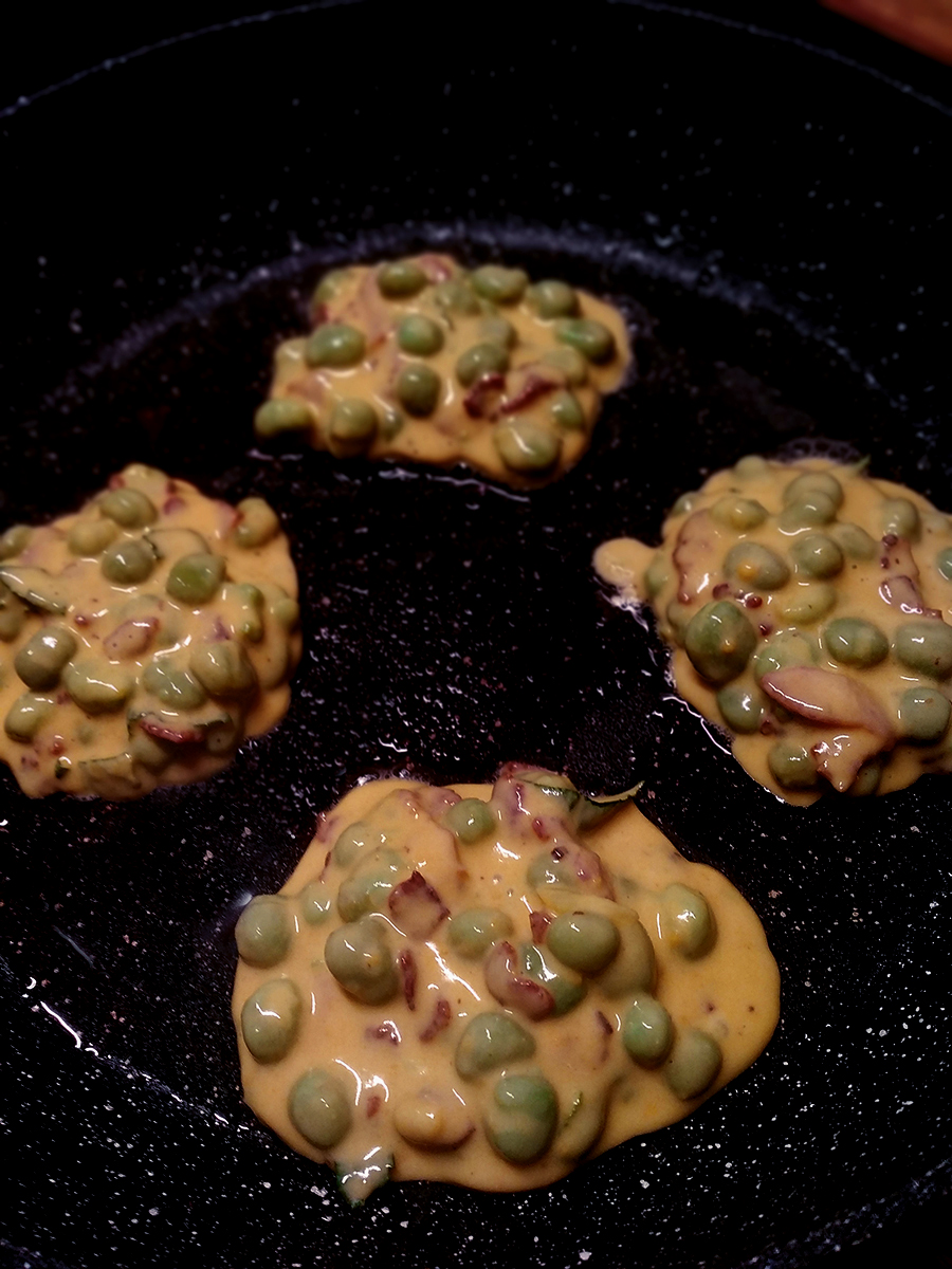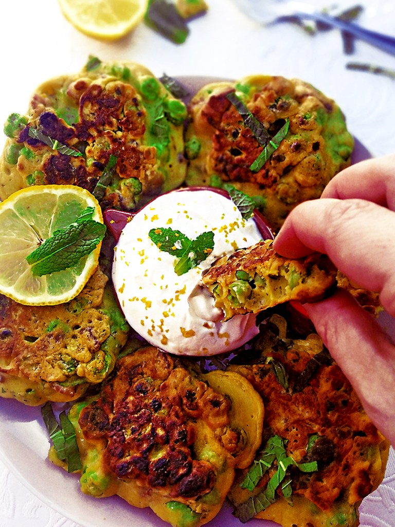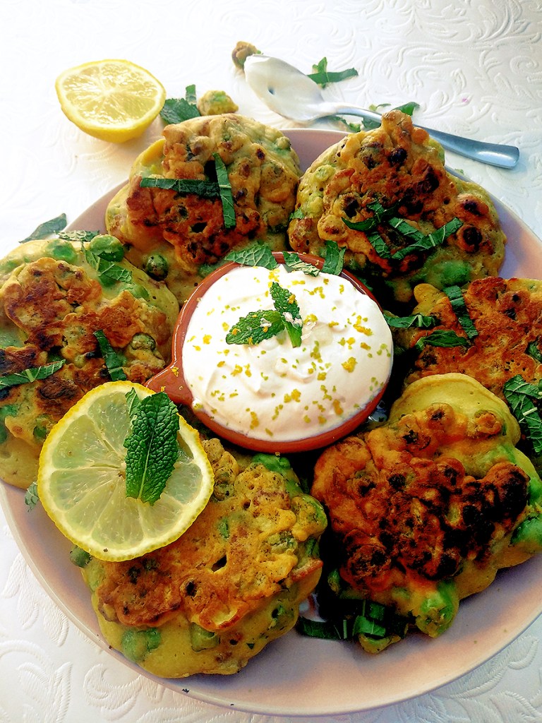 - Sift the flour into a mixing bowl then add the egg and whisk then gradually add the water until you have a batter. Add the peas and half of the mint finely chopped then stir to combine. Pre-heat the oven to 120° (100° fan). Ladle small amounts of the batter into the pan. Do not overcrowd the pan, you can do this in batches while you keep the cooked ones warm in the oven. Cook the fritters for 2-3 minutes before turning them and cooking for another couple of minutes.