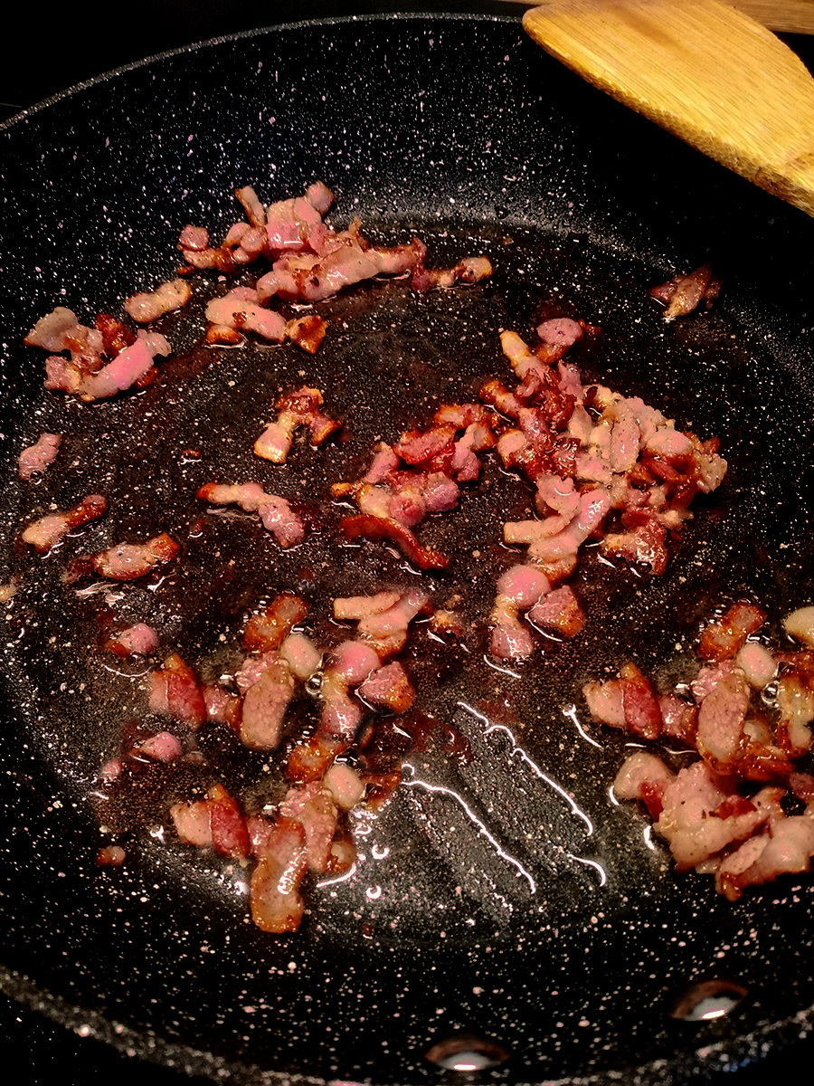 - Cut the bacon into small slices (lardons). Put some olive oil into a medium sized frying pan over a medium/high heat. Add the chopped bacon to the pan and cook for 3-5 minutes until it is crispy then use a slotted spoon to transfer the cooked bacon to some kitchen roll. Leave the fat in the pan.