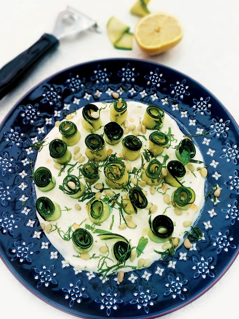 - Spread some sour cream or plain yoghurt onto a dinner plate so it’s about half a cm thick. Roll each ribbon into a rose then stick them in the sour cream. Once you’ve finished sprinkled over the pine nuts. Squeeze over some lemon and grind over a little more salt then scatter with mint and drizzle with chilli oil if you’re using them.