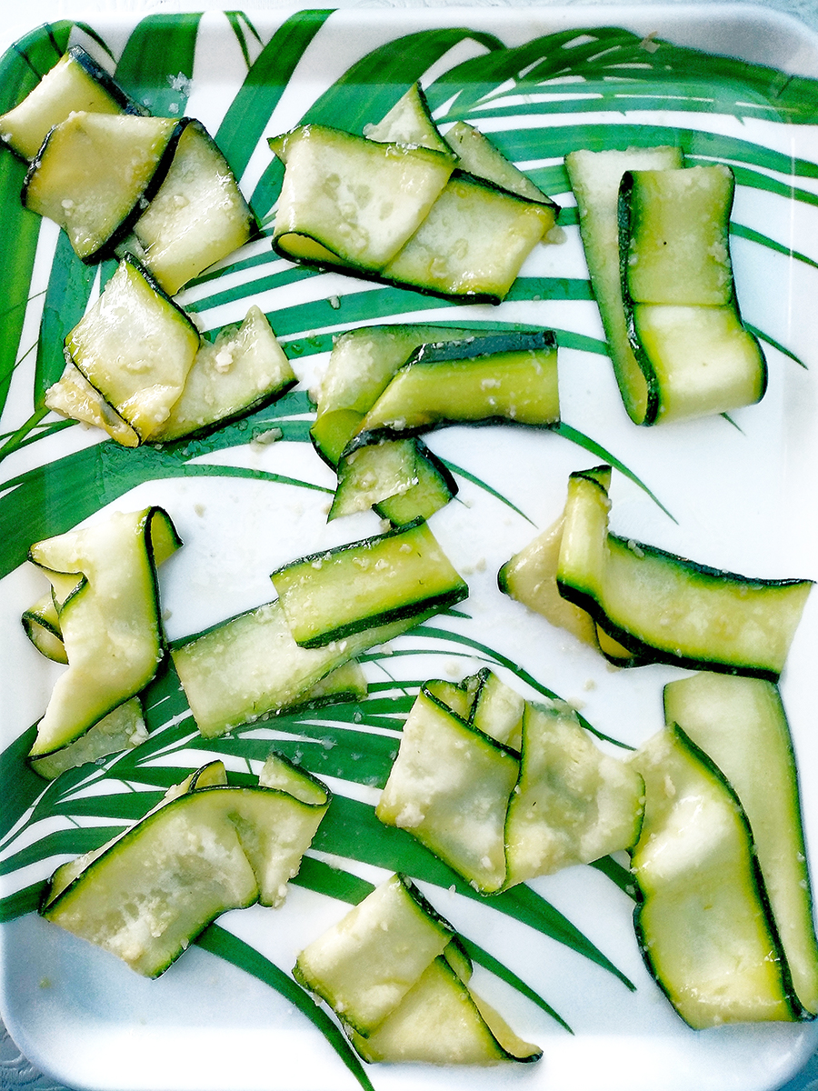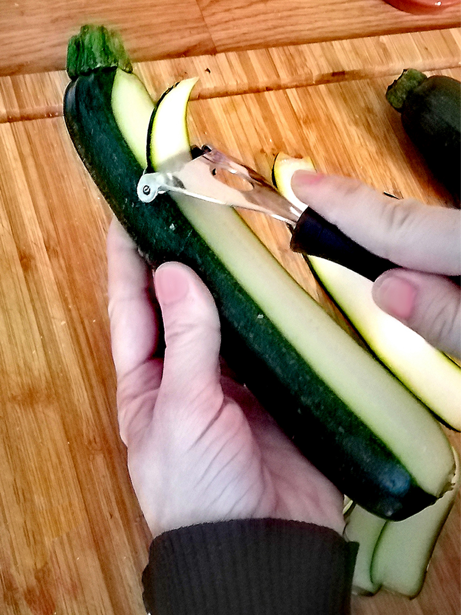 - Use a vegetable peeler to create ribbons of courgette. Apply enough pressure to get ribbons 2mm thick. Discard the first ribbon which will be all green skin. Once you’re down to the seeds turn the courgette over and continue making ribbons.