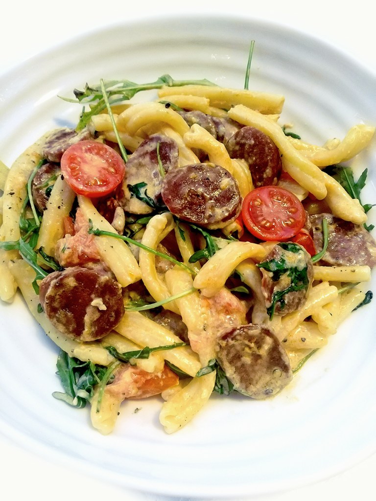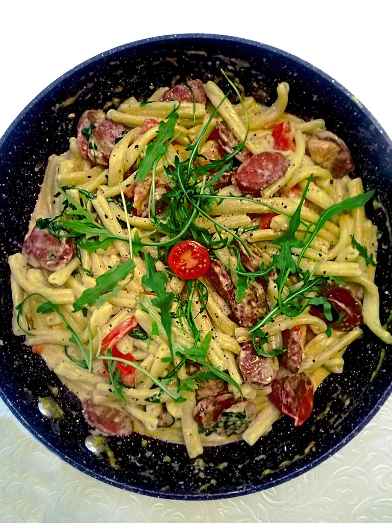 Chorizo is packed full of flavour so you don’t have to add many other ingredients to get a tasty meal. You can use any short pasta for this dish (rather than long pasta like spaghetti) and have the whole thing ready in the time it takes to cook the pasta. I use casarecce (which translates as homemade) but you can use penne or fusilli. The lemon is essential because the acid balances out the spice of the chorizo. Finishing the dish with some fresh rocket and tomatoes adds texture.