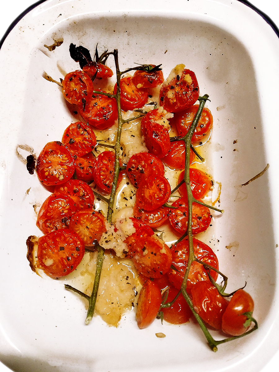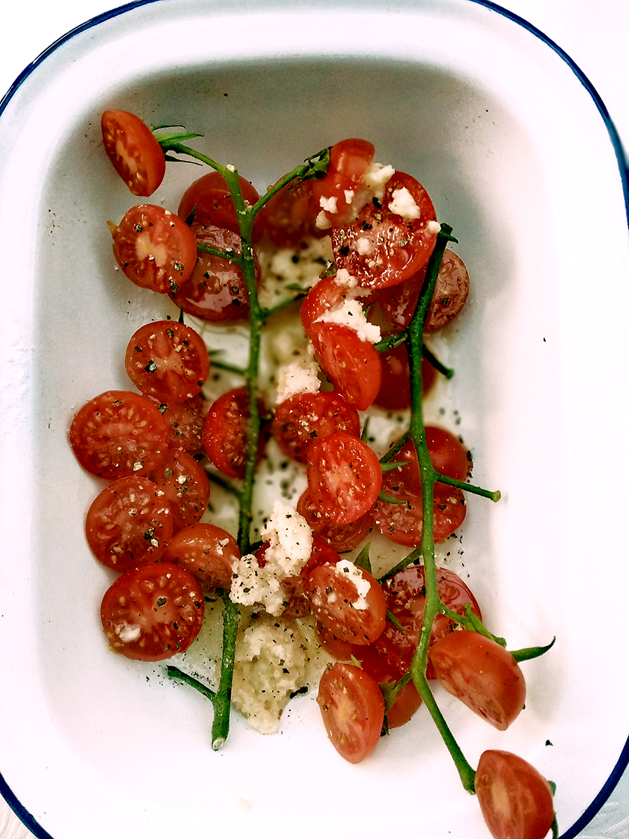 - Remove the tomatoes from the vine and put the vines in a baking dish. Cut the tomatoes in half and grind over with salt and pepper. Chop the garlic and crush it to make a paste then add to the dish and pour over half the olive oil (30ml) and toss everything together. Put the dish under a 220°C grill for 10 minutes.