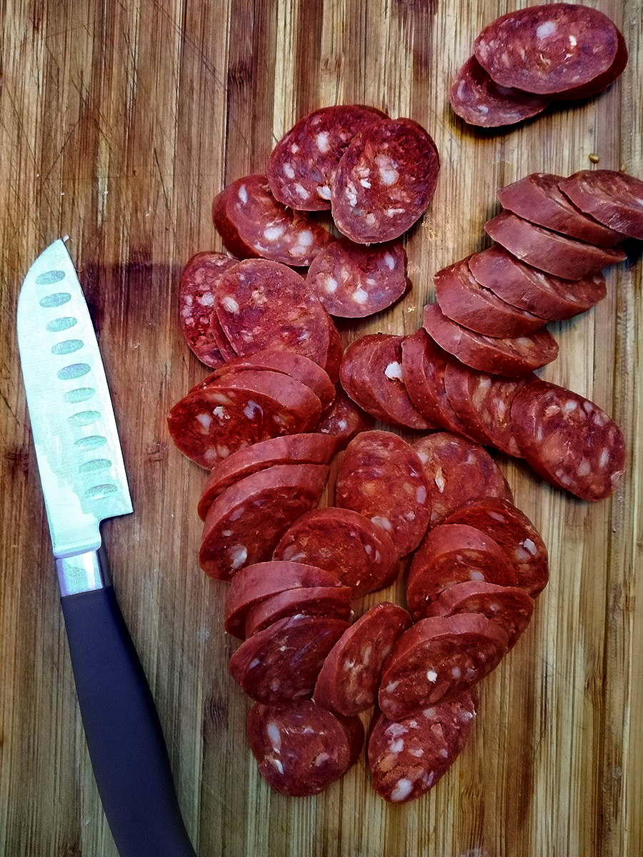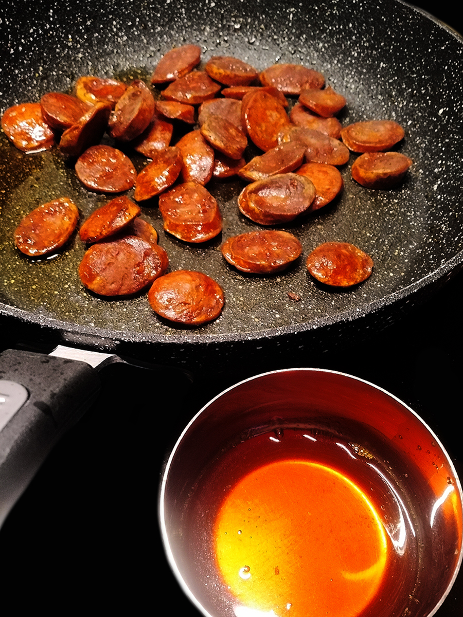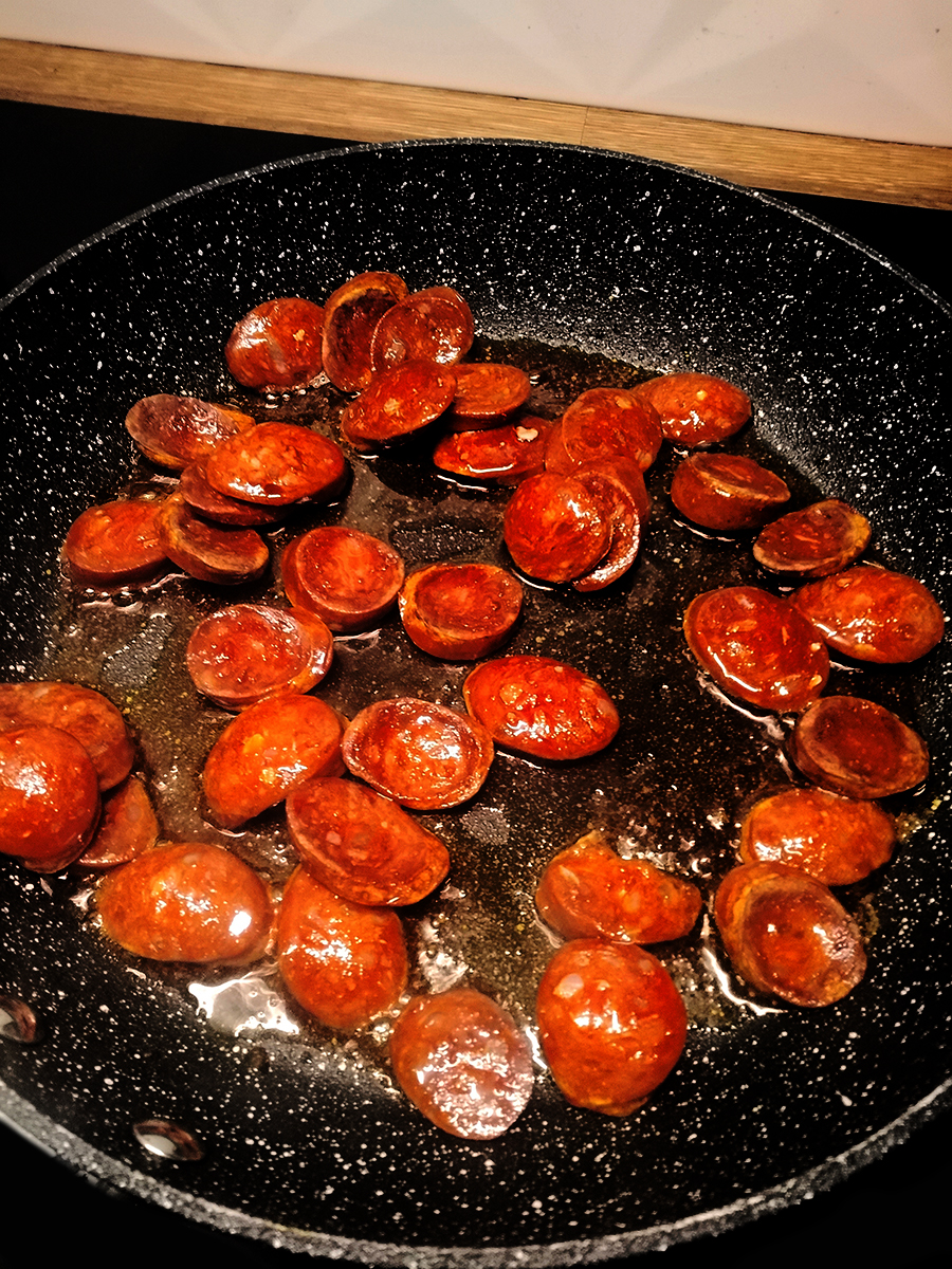 - Chop the chorizo into discs. Add the other half of the oil (30ml) to a large skillet on a medium high heat and cook for 3 minutes on each side. The chorizo will leach lots of oil so after 6-7 minutes spoon off all but about a tablespoon of oil and turn the heat down to medium.