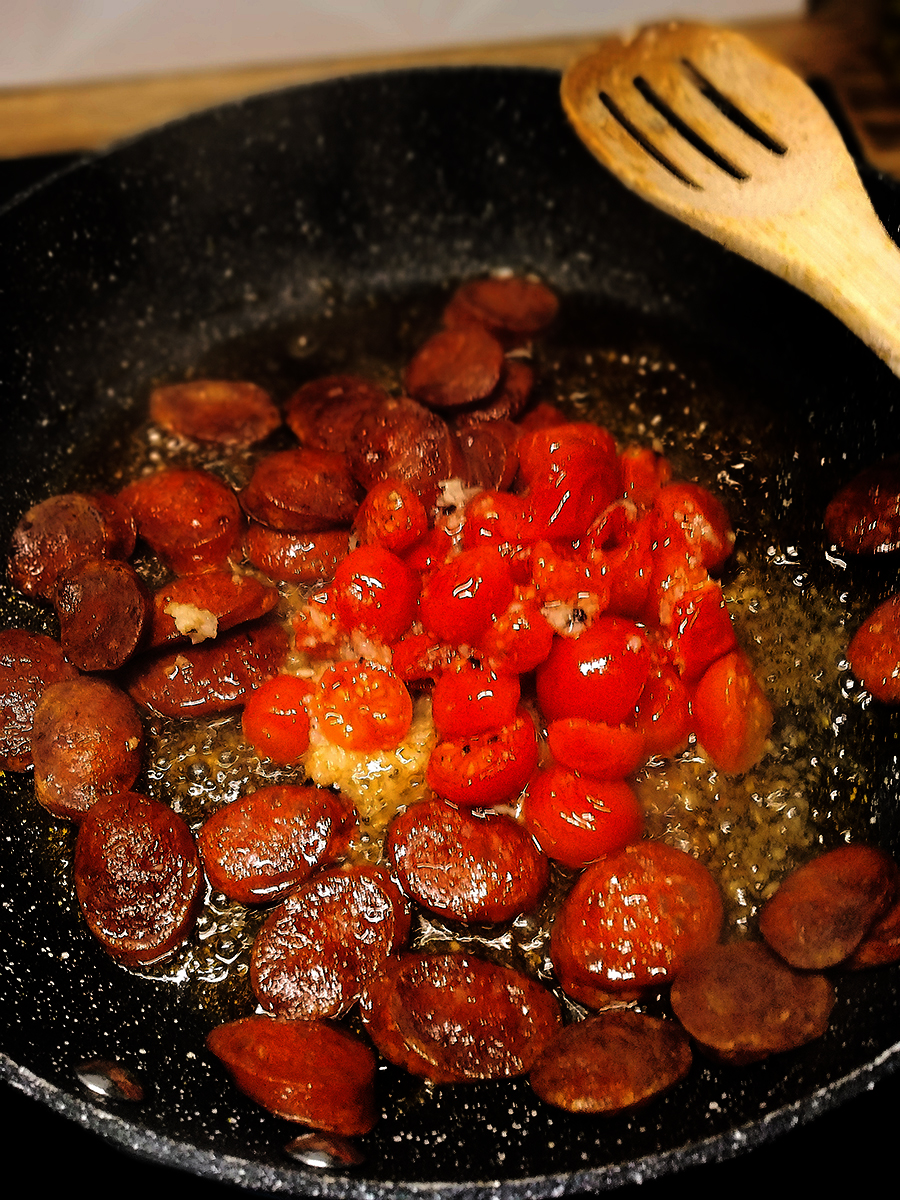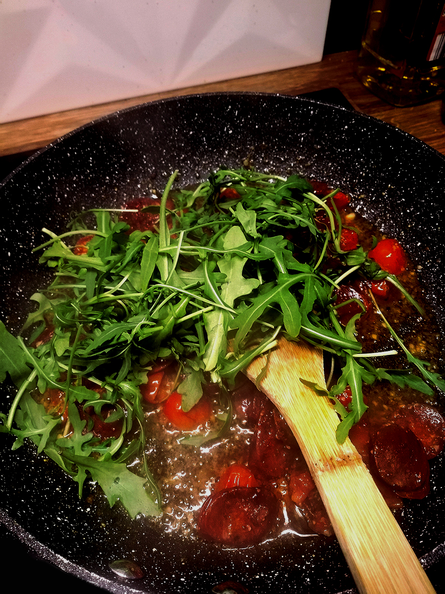 - Squeeze over the juice of half a lemon and stir. Heat for 2 minutes. When the pasta is cooked, drain (reserving a little pasta water) and add to the skillet along with the water and toss everything together. Serve and finish with some fresh rocket, halved fresh tomatoes and a drizzle of the chorizo oil.