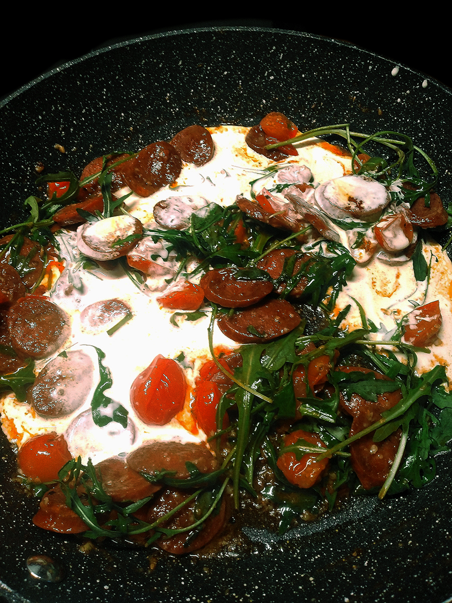 - Remove the stalks from the tomatoes and add everything else to the pan then add the rocket and give it a stir. Take the pan off the heat while you pour in the cream and stir then put the pan back on the heat.