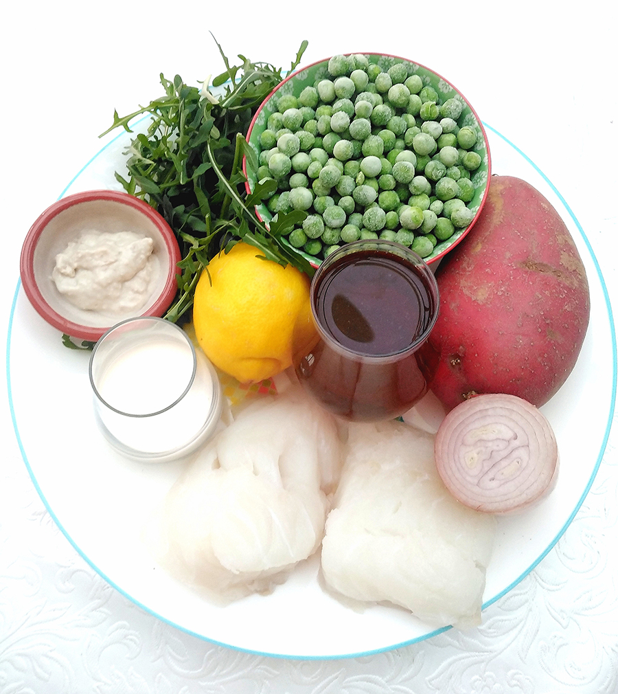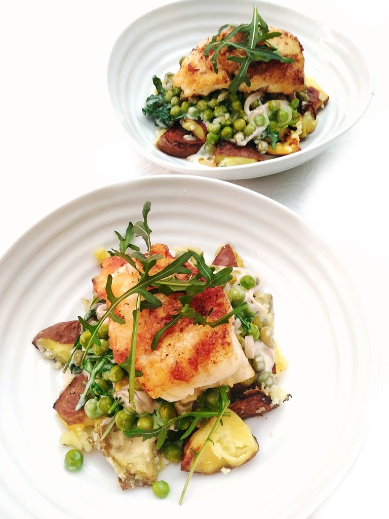 - Place the potatoes in the bottom of shallow bowls or plates then spoon over the peas and sauce then top with the fish and squeeze a little lemon over each piece of fish. Scatter a few fresh rocket leaves over to finish.