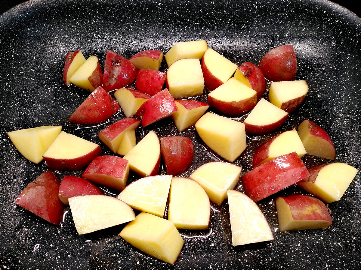 - Pre-heat the oven to 220°C (200°C fan). Chop the potatoes into 2cm cubes and tip into a large baking tray then drizzle with olive oil, grind over with salt then add 3 tbsps of stock to the dish and bake for 25 minutes. Once the potatoes are cooked, press down on them with a fork or potato masher to break the skins, then grind over with salt.