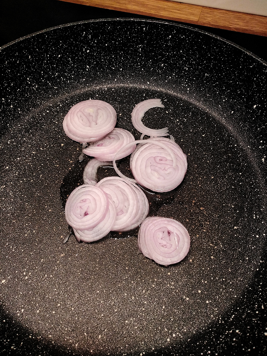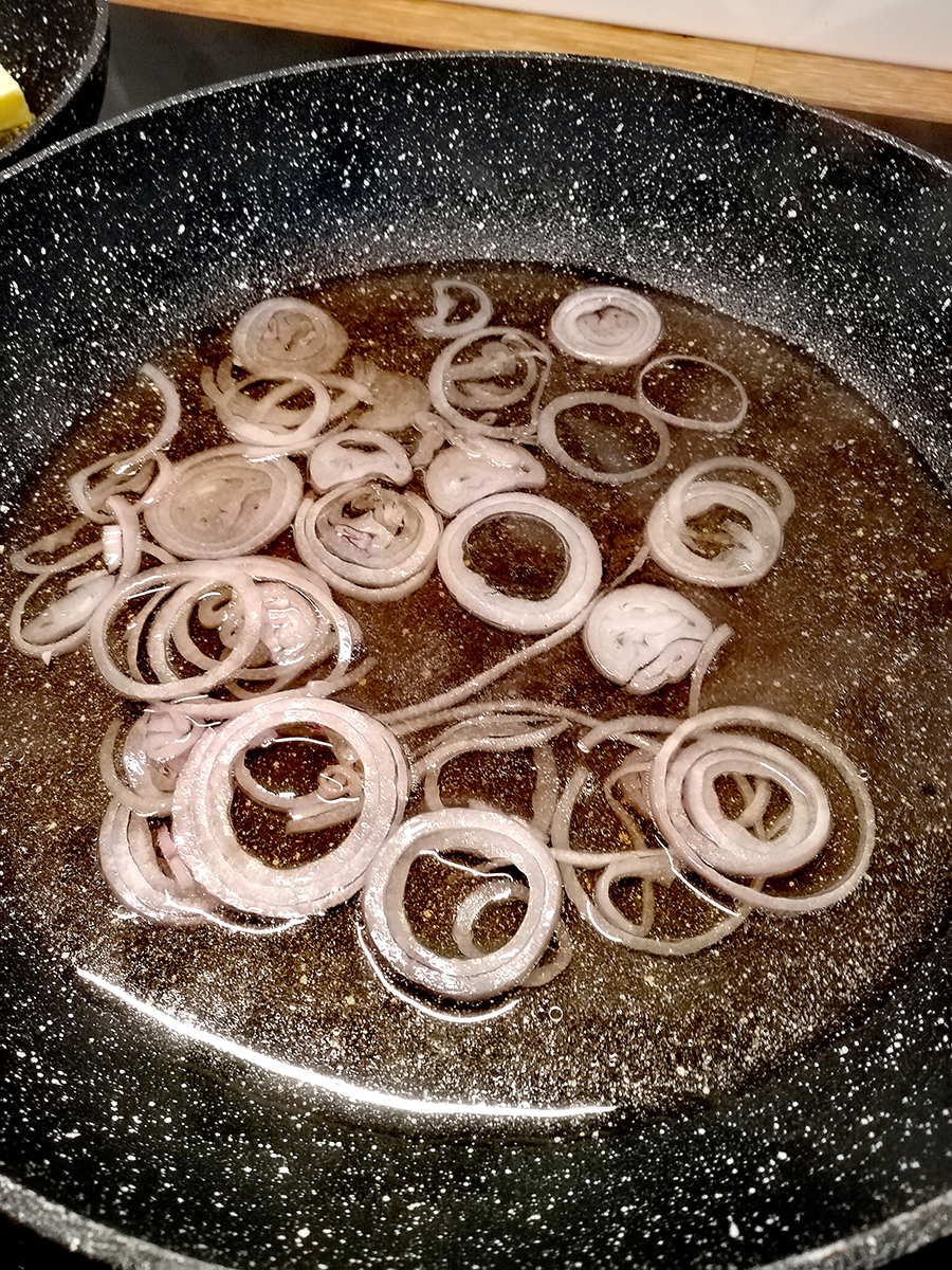 - Put 1 tbsp of olive oil into a medium sized skillet or frying pan on a medium high heat. Peel and thinly slice the shallot and soften in the oil for 2-3 minutes, stirring so that they don’t burn. Add the stock and turn the heat down to medium.